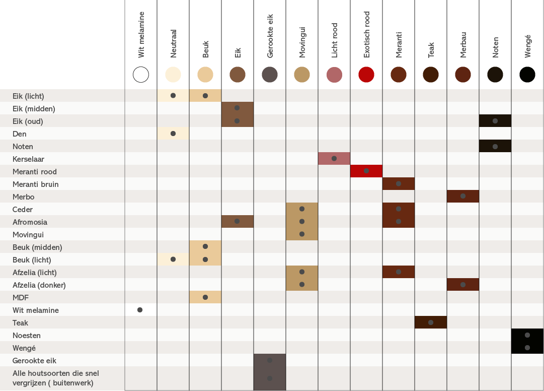Wanneer de eindafwerking een donker kleur wordt, kies dan een 'Alsibois -tint', dewelke ongeveer gelijkend is aan de kleur van het hout.