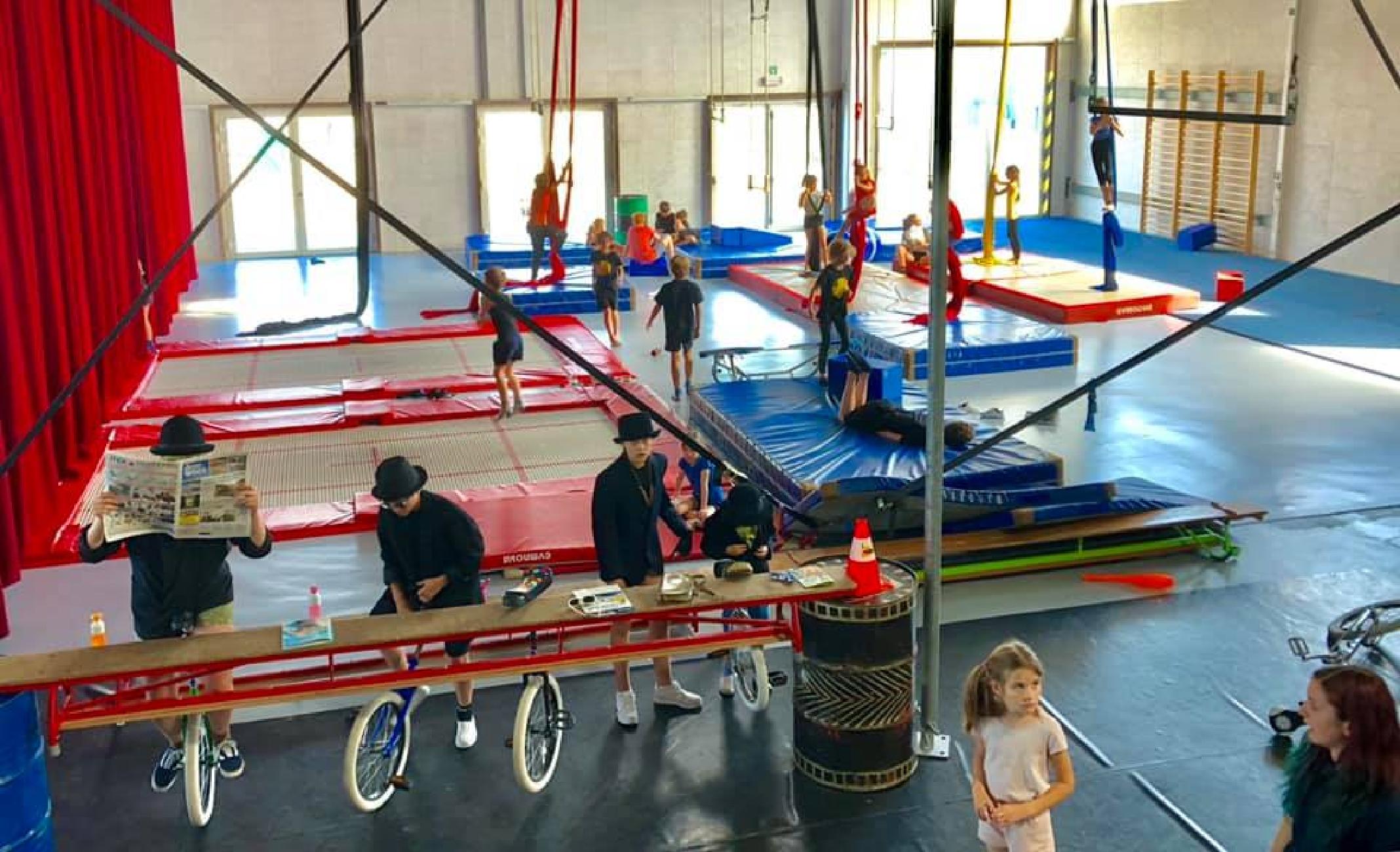 Op onze thuisbasis in Mechelen hebben we alle materialen ter beschikking. Ons plafond is ruim 7m hoog. Stel je eens voor hoe hoog die diabolo's kunnen vliegen! In onze zaal kunnen we met een team van maximaal 80 personen aan de slag. Circusvibes gegarandeerd!
