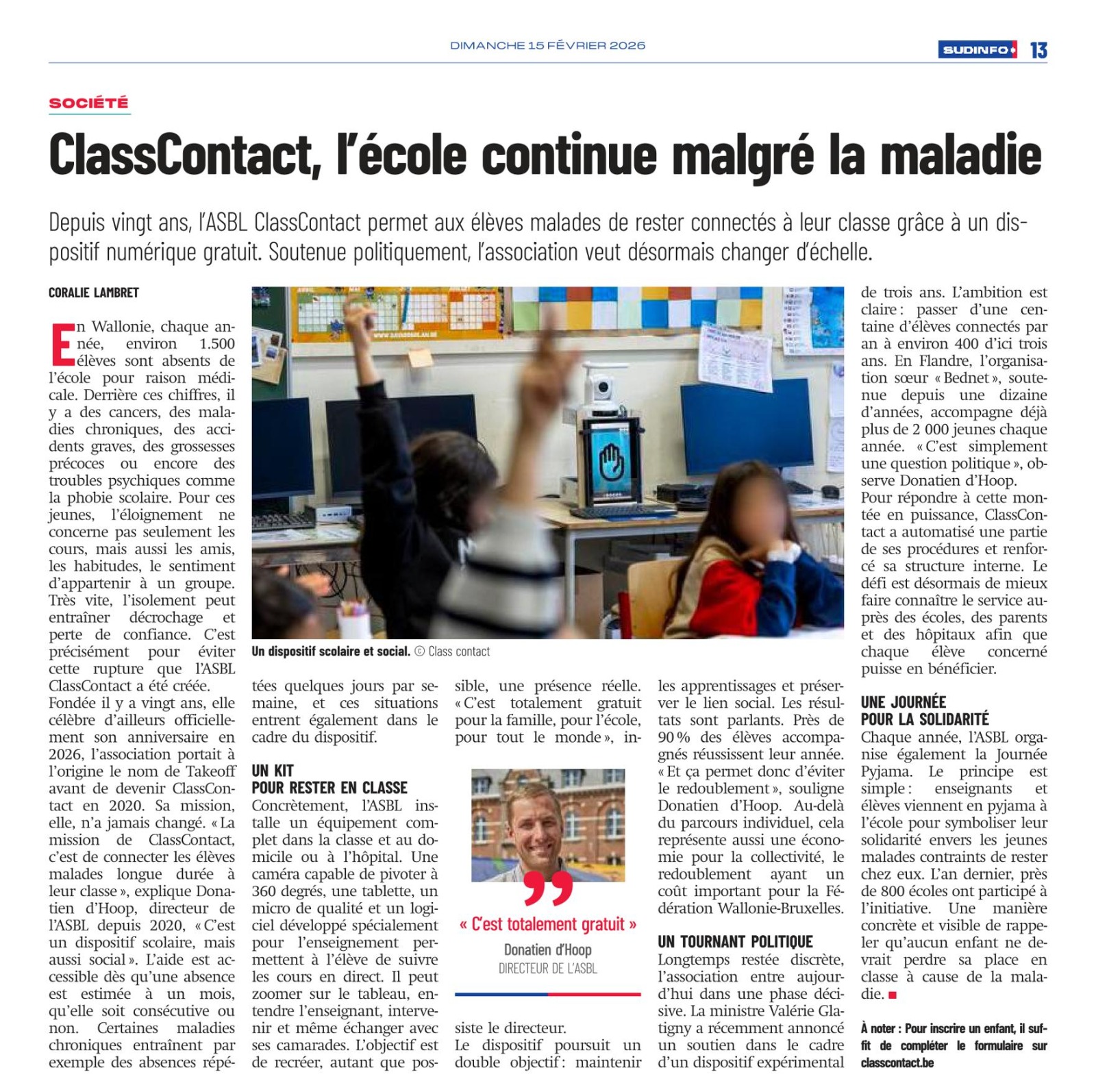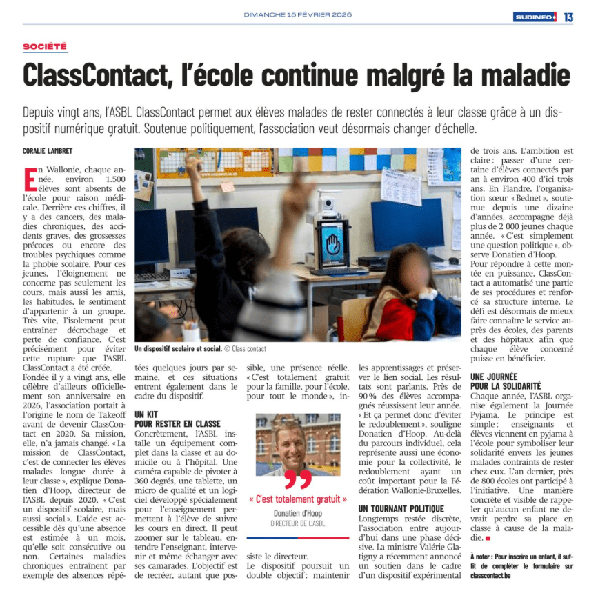 Le journal Sudinfo a récemment consacré un article à ClassContact, mettant en avant son rôle essentiel pour permettre aux élèves malades de poursuivre leur scolarité.