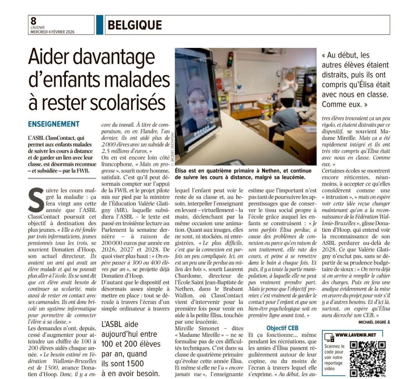 Nous sommes très heureux de voir ClassContact mis à l’honneur dans le journal L’Avenir, dans un article consacré à l’importance de maintenir le lien scolaire des enfants absents pour raisons médicales.