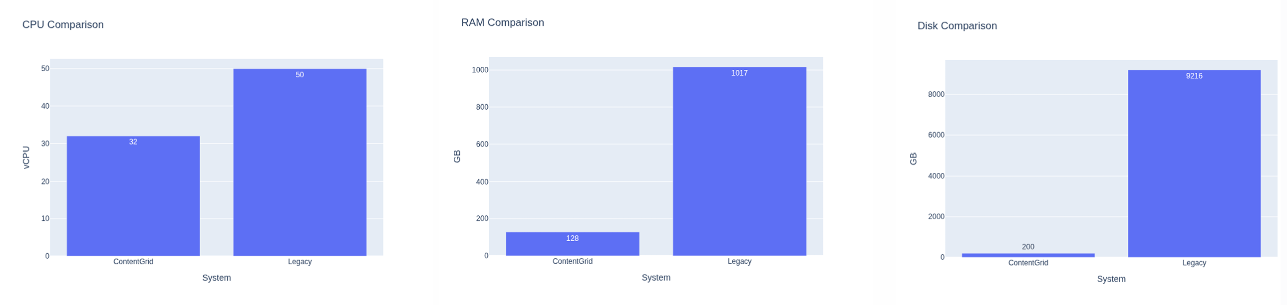 We have benchmarked ContentGrid against a real-world Legacy ECM. The increased performance we obtained is a result of lean architecture, and does not require increasing cloud resources and costs. While ContentGrid has a significant impact on required CPU, the savings become extreme in the amount of RAM, notably through the elimination of an external search service.