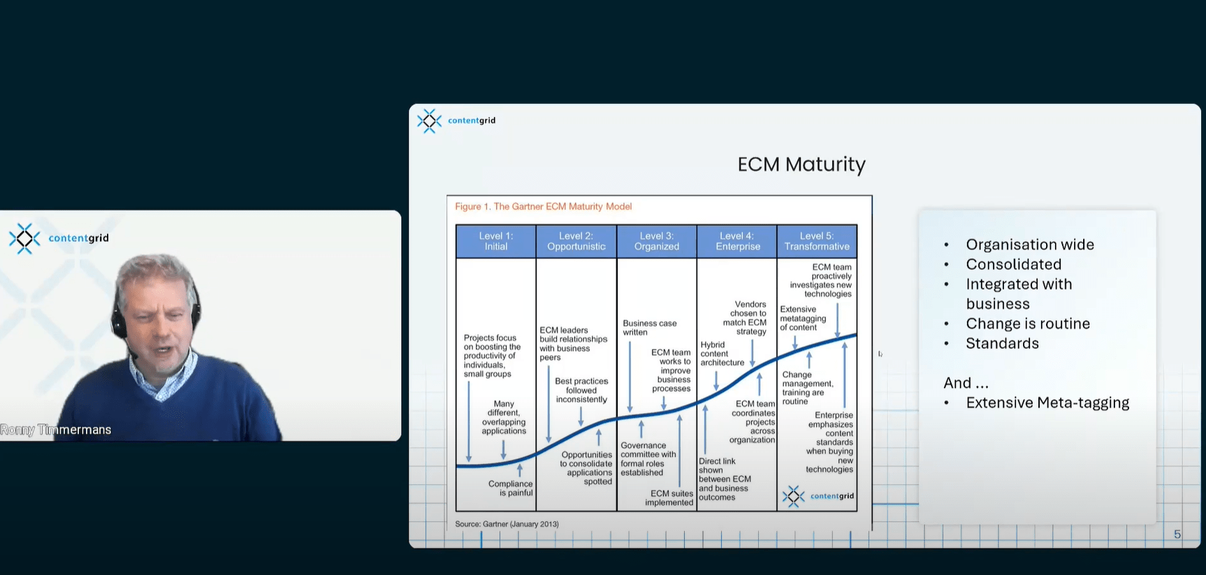 In our recent webinar, Gartner's ECM Maturity Model was discussed, positioning ContentGrid at Level 5, which represents transformative content services. However, the team hinted that even Gartner may have overlooked a critical next step: cloud-native, API First and AI Friendly content services, which they believe represents the next frontier, beyond ECM.