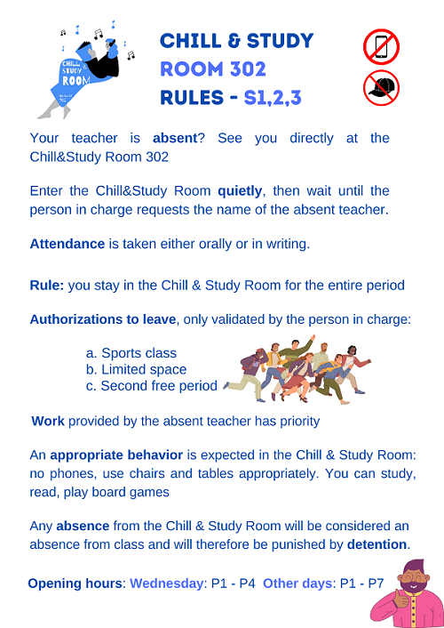 The large Chill & Study Room 302 is reserved to pupils from S1 to S3. It is open from P1 to P7 on long school days and from P1 to P4 on Wednesdays (except breaks). A coordinator or their replacement will always be present. If the room is unexpectedly closed, students should wait at least 10 minutes in the hall before notifying their educational adviser.