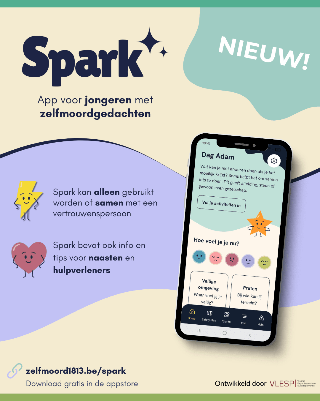 Het VLESP (Vlaams Expertisecentrum Suïcidepreventie) ontwikkelde de gratis app Spark. Deze app is bedoeld om kinderen en jongeren met zelfmoordgedachten een houvast en hoop te geven.