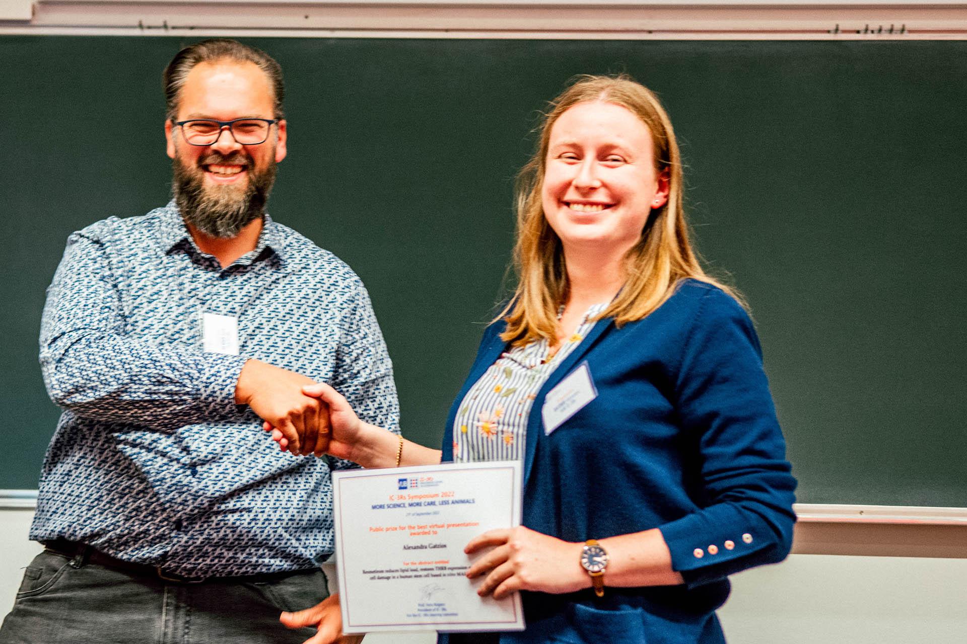 After an animated lunch served by enthusiastic IC-3Rs collaborators, the afternoon was dedicated to Refinement and Replacement. Realistic case studies were discussed between representatives of the Ethical Committees on Experimental Animalsof 6 Belgian universities and the audience. Awards for the best video clip (Laura Cools & Mina Kazemzadeh Dastjerd) on the 3Rs, best poster (Robin Maximilian Award) and best pitch (Alexandra Gatzios) made this day also a peak event for young researchers.