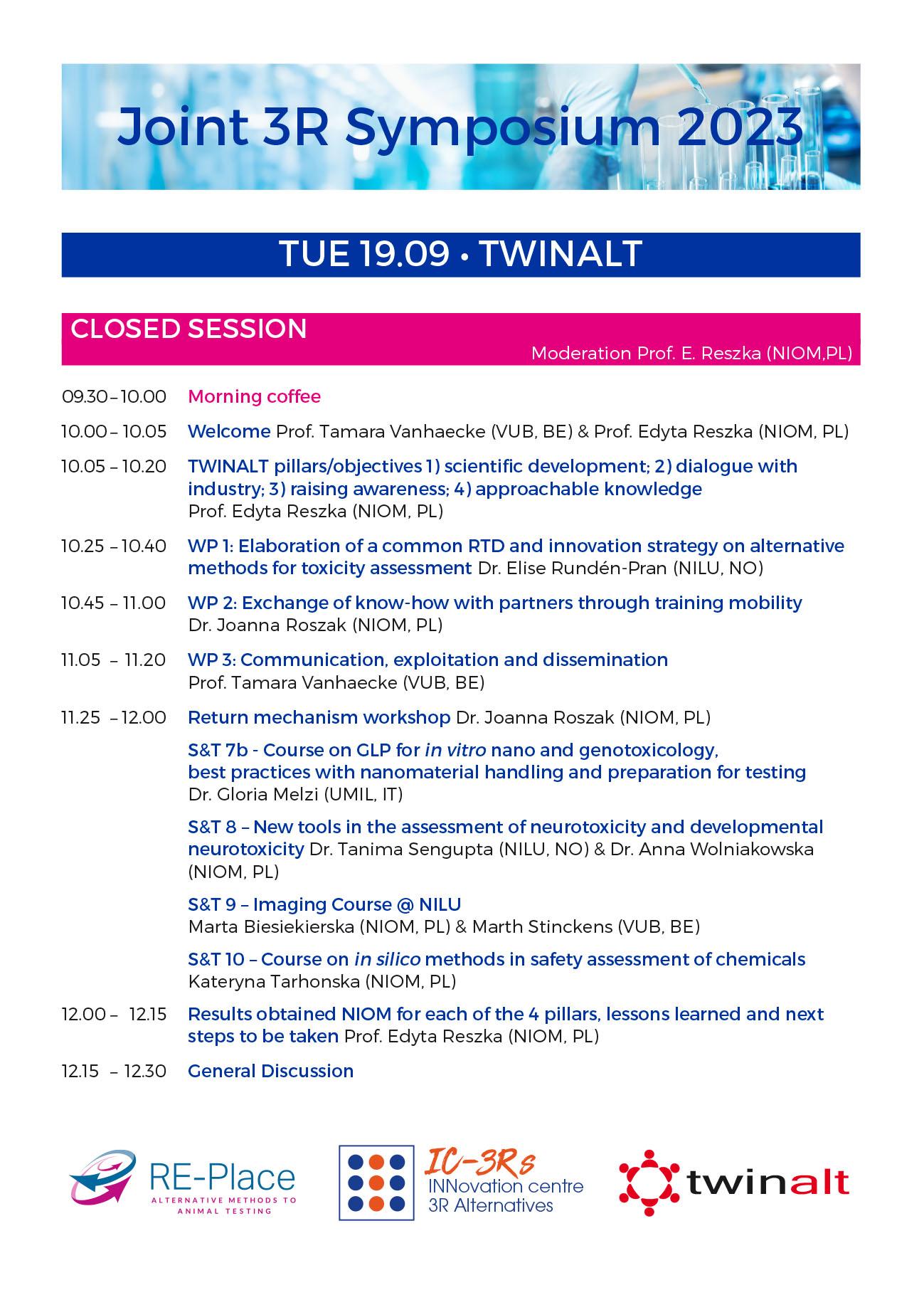 The Joint 3R Symposium runs during 3 consecutive days and will start with a closed pre-meeting of the TWINALT consortium in the morning of the 19th September 2023. TWINALT is a European Horizon 2020 funded project between the Nofer Institute of Occupational Medicine (NIOM), the Vrije Universiteit Brussel (VUB), the Norwegian Institute for Air Research (NILU) and the University of Milan (UMIL). The aim of TWINALT is to increase the capacity of the institute NIOM, based in the Widening Country Poland, towards available in vitro methods for toxicity testing by knowledge exchange and trainings. The afternoon session is open to all and will be devoted to keynote lectures on TWINALT relevant topics.