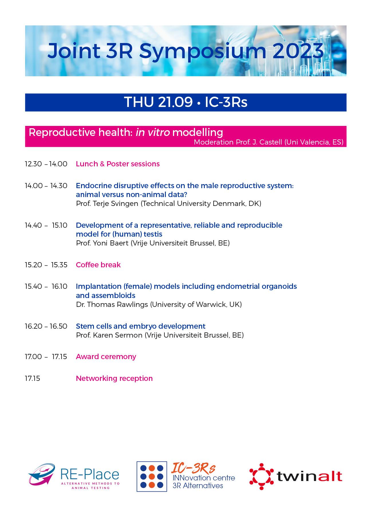 The Annual IC-3Rs Symposium will be organized on the last day, Thursday the 21st of September. Until recently, most research in complex fields such as neurology, reproductive biology, neurotoxicology and reproductive toxicology, was carried out using experimental animals. However, studies of the brain and reproductive system in rodents rarely yield results applicable to humans. Therefore, new 3R-alternative methods for research on the brain and reproductive organs are emerging and will receive special attention during that day.