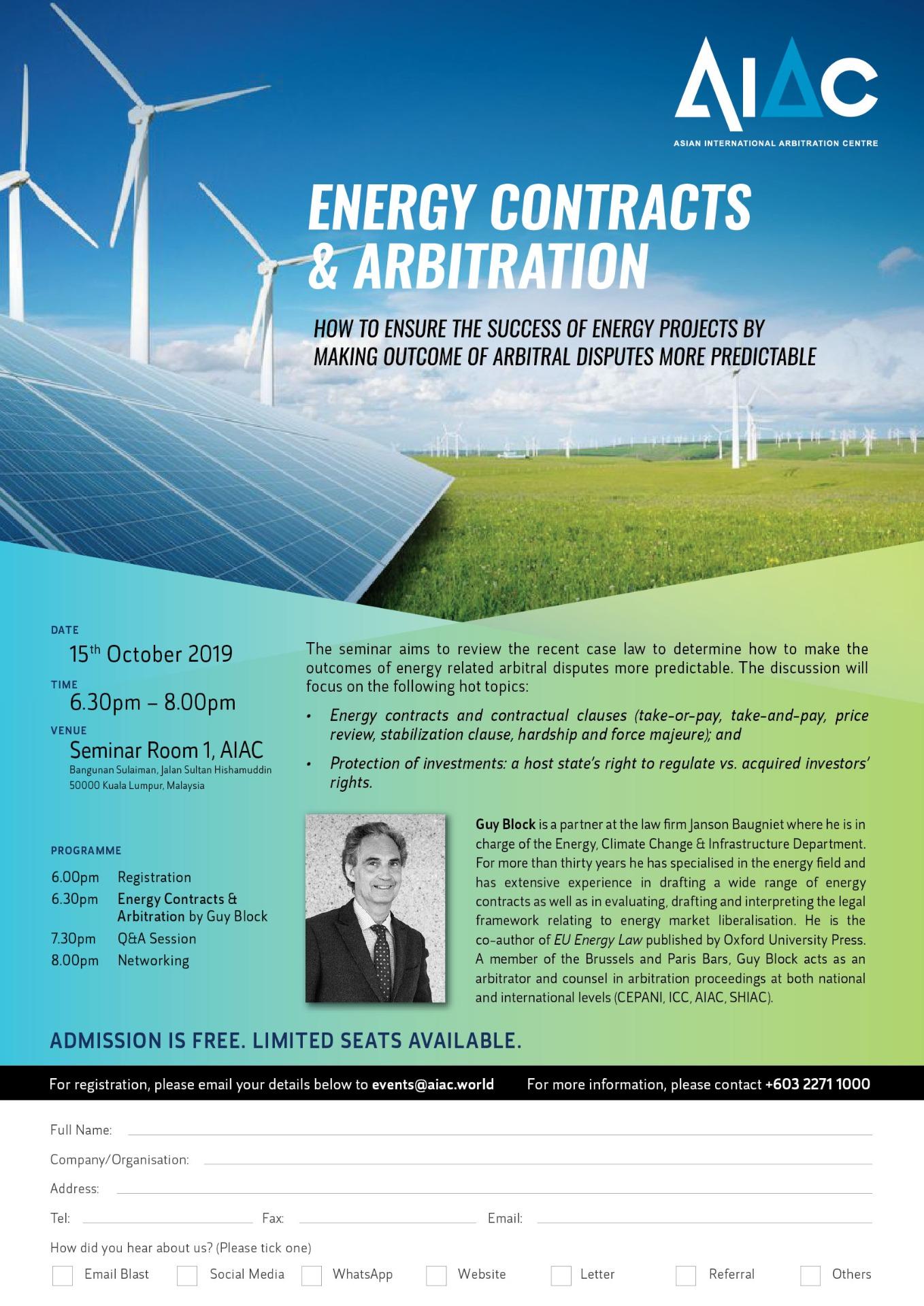 Guy Block (Partner at Janson) was invited by the Asian International Arbitration Center (AIAC) this 15th October 2019 to host a seminar on ‘Energy Contracts and Arbitration’: AIAC