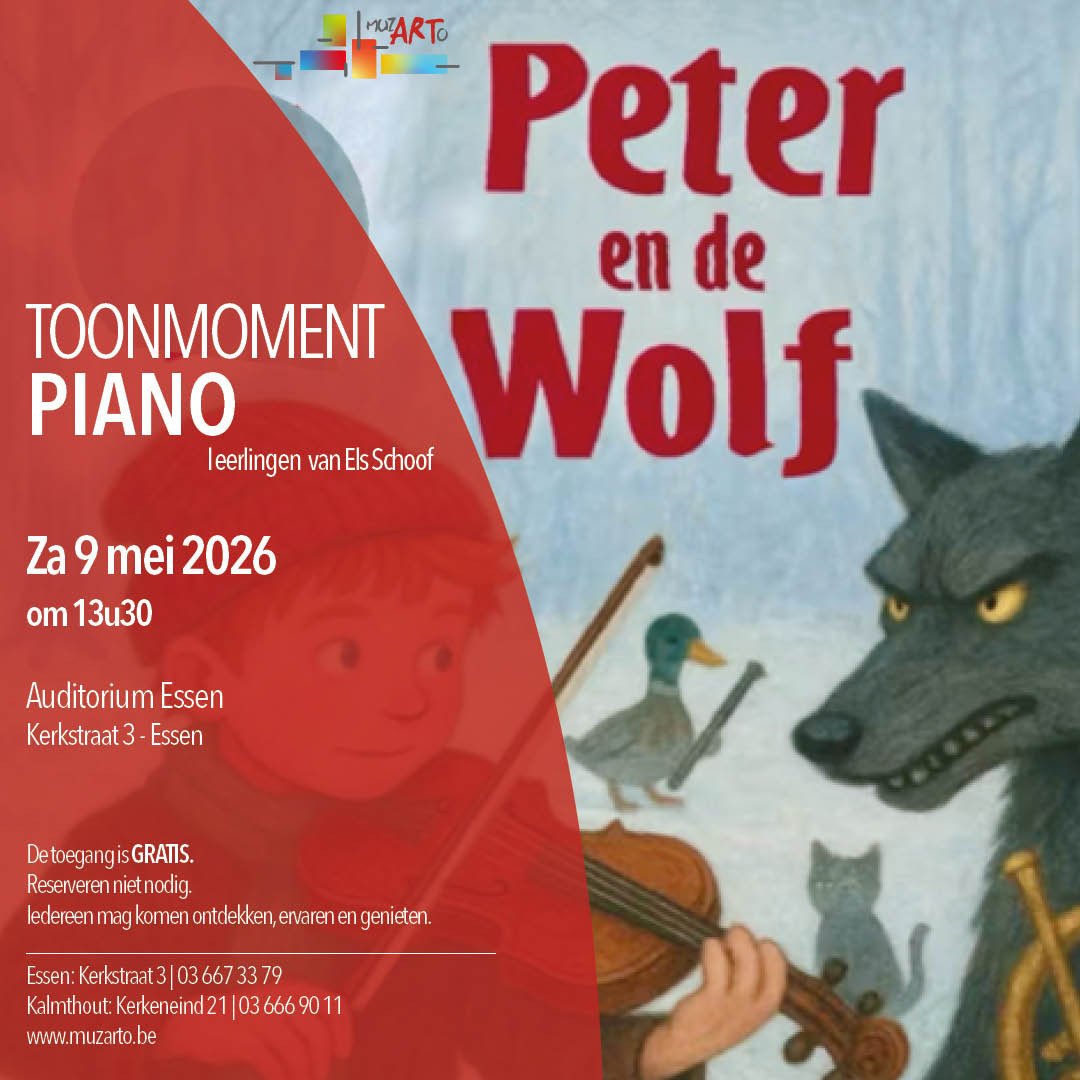 09-05-2026 Deel dit bericht opToonmoment pianoLeerlingen piano van Els Schoof brengen het sprookje 'Peter en de Wolf' tot leven.Aanvang: 13u30Locatie: academie Essen - Kerkstraat 3 VorigeVolgende Overzicht