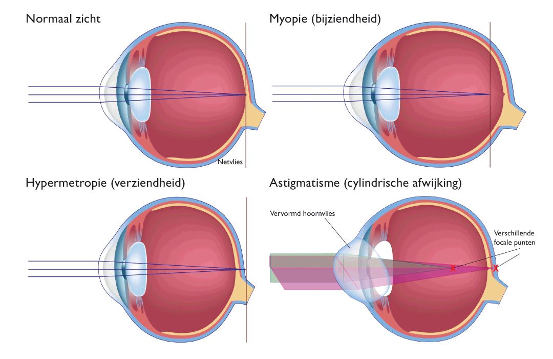Evenwijdige lichtstralen uit de verte worden aan het oogoppervlak gebroken en komen bij elkaar in een brandpunt dat op het netvlies ligt. Zo ontstaat een scherp beeld.
