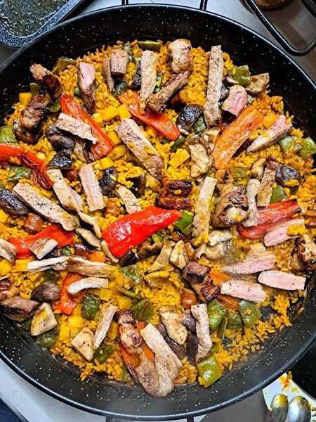 In Spanje houdt men het meestal vrij sober. De rijst staat centraal in het gerecht en smaakt heerlijk nadat ze alle aroma's geabsorbeerd heeft. De andere ingrediënten (vlees, vis of zeevruchten) worden met mate gebruikt.