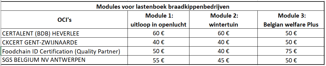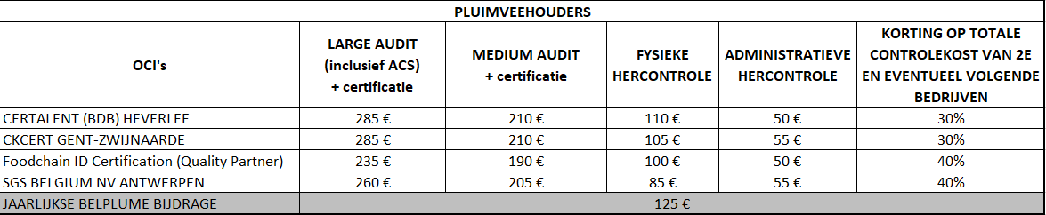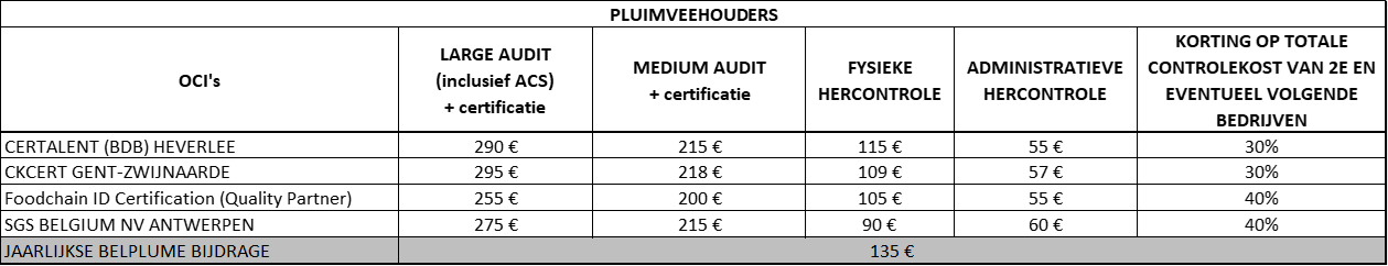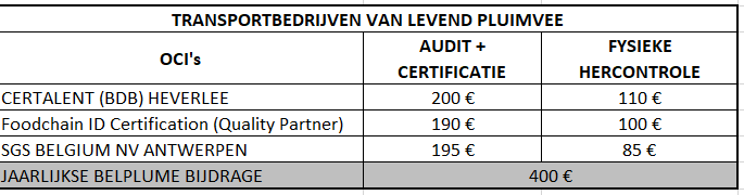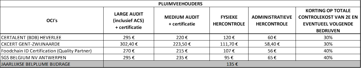 De tarieven (exclusief BTW) voor pluimveehouders zijn geldig voor de lastenboeken