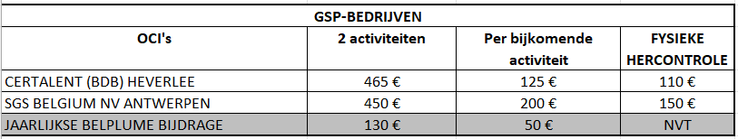Het tarief (exclusief BTW) voor GSP-bedrijven is geldig voor het lastenboek GSP-bedrijven.