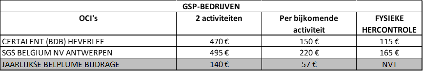 Voorbeeld; Een GSP-bedrijf met 3 activiteiten dient volgende totaalprijs te betalen bij Certalent; Totaalprijs = €470 + €140 + €57 + €100