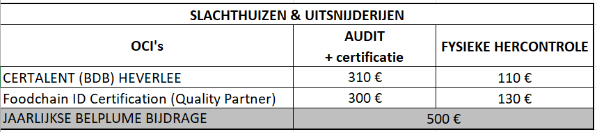 Het tarief (exclusief BTW) voor slachthuizen & uitsnijderijen is geldig voor het lastenboek slachthuizen & uitsnijderijen.