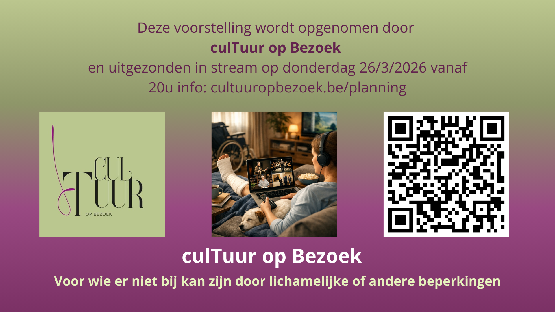 CulTuur op Bezoek is een Oudenaards vernieuwend initiatief om cultuur toegankelijk te maken voor personen die door fysieke of andere beperkingen niet zelf naar evenementen kunnen gaan. De organisatie biedt de mogelijkheid om via livestreaming de lezing door stadsarchivaris Stijn Lybeert, Broederlijk in oorlogstijden, het verhaal van Emiel en Gustaaf Vander Stuyft mee te maken. Deze voorstelling wordt opgenomen door culTuur op Bezoek en uitgezonden op 26 maart.