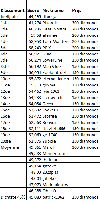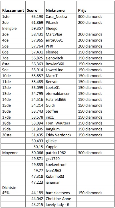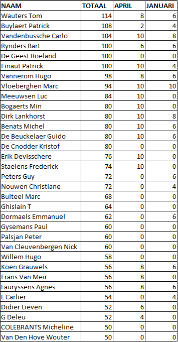 Alle behaalde punten blijven tellen, behalve de punten van degenen die in de prijzen gevallen zijn. Die beginnen terug vanonder. Zo kan Iedereen een prijs winnen, meedoen is de boodschap.Zie hiernaast voor de huidige ladder-stand