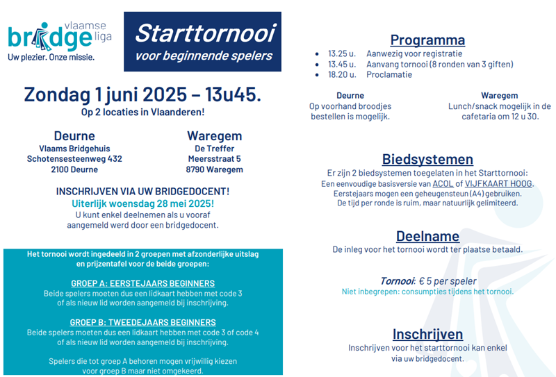 Inschrijvingen kunnen enkel via uw bridgeleraar.