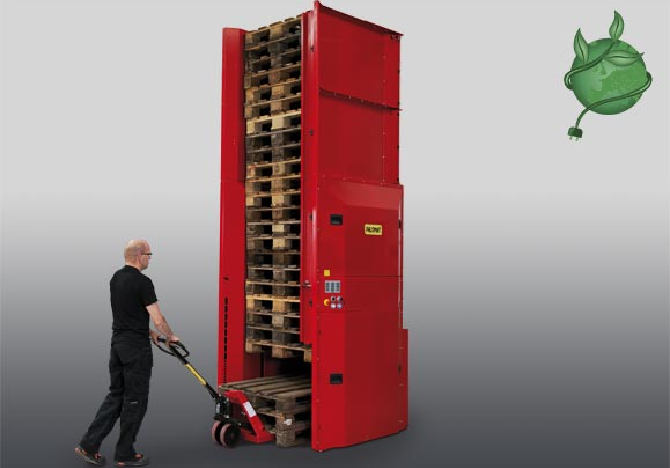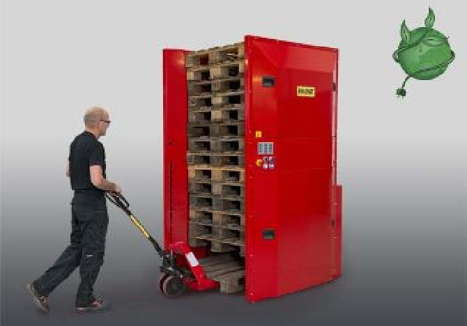 De palletstapelaar/palletmagazijn Palomat 5 is een toestel waarbij de operator 1 tot 5 pallets tegelijk kan afnemen of toevoegen langs de onderkant van de stapel, met behulp van bvb een transpallet. Alle pallethandling gebeurt dus op vloerniveau.
