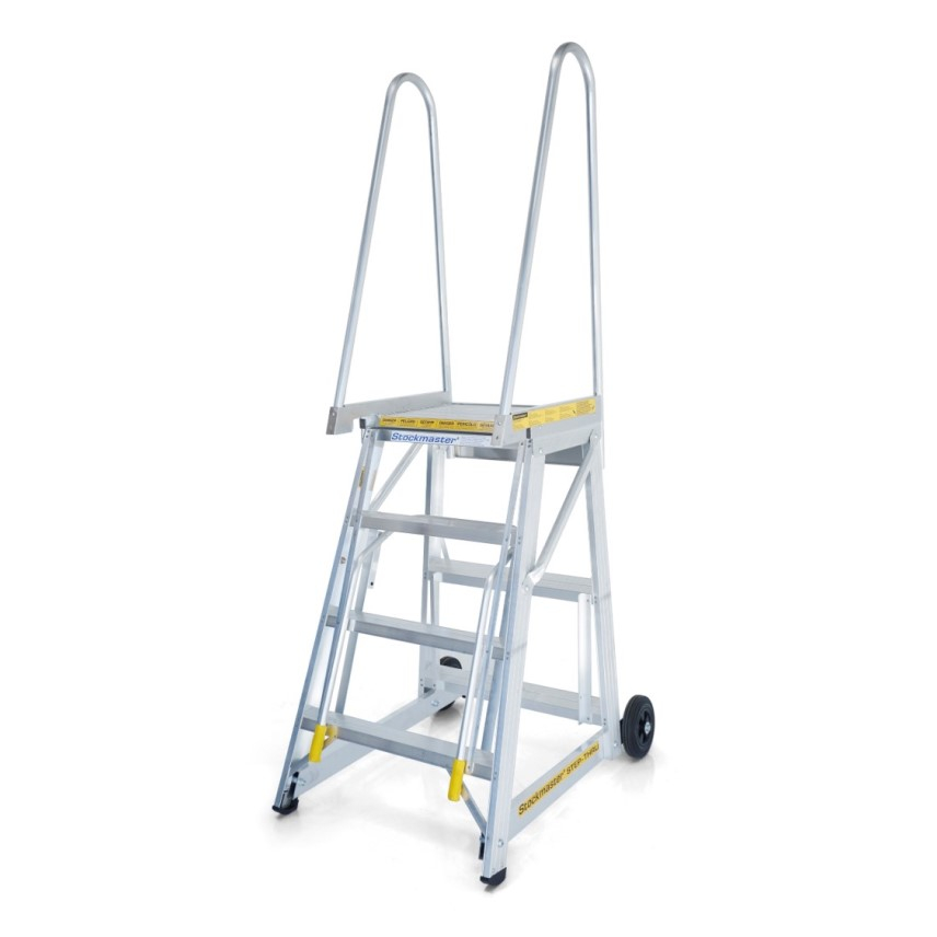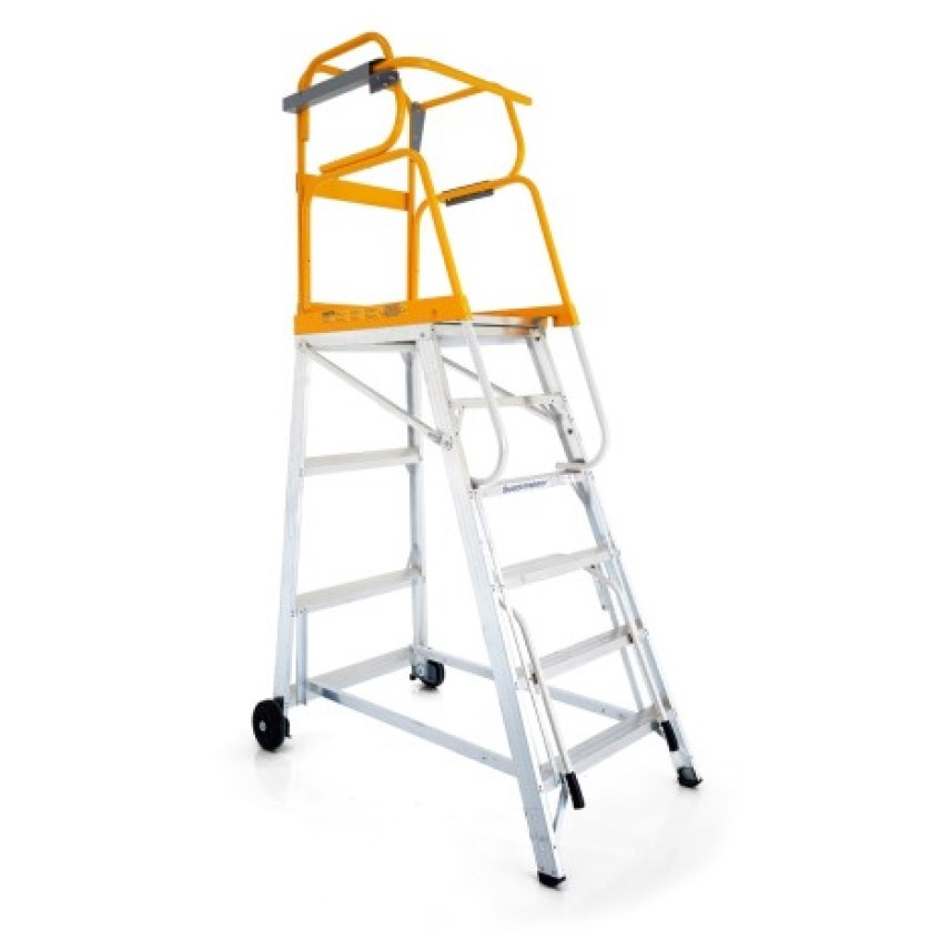 Het plateau kan precies op de juiste hoogte gebracht worden om voorwerpen op/af legborden te schuiven en kan eenvoudig omhoog/omlaag gebracht worden om gestapelde voorwerpen steeds op de juiste werkhoogte te houden.