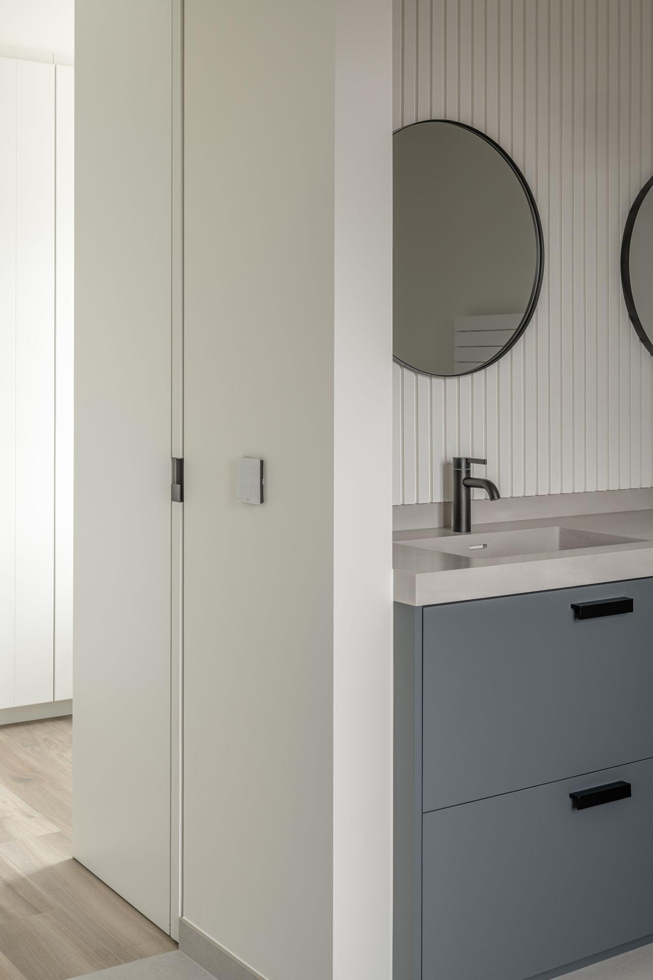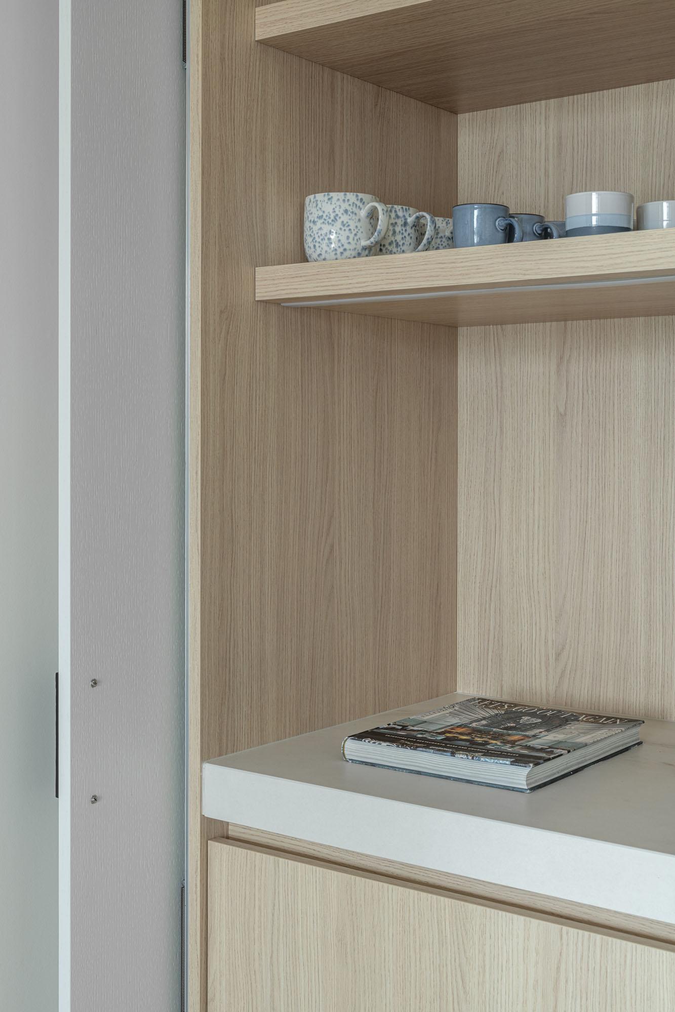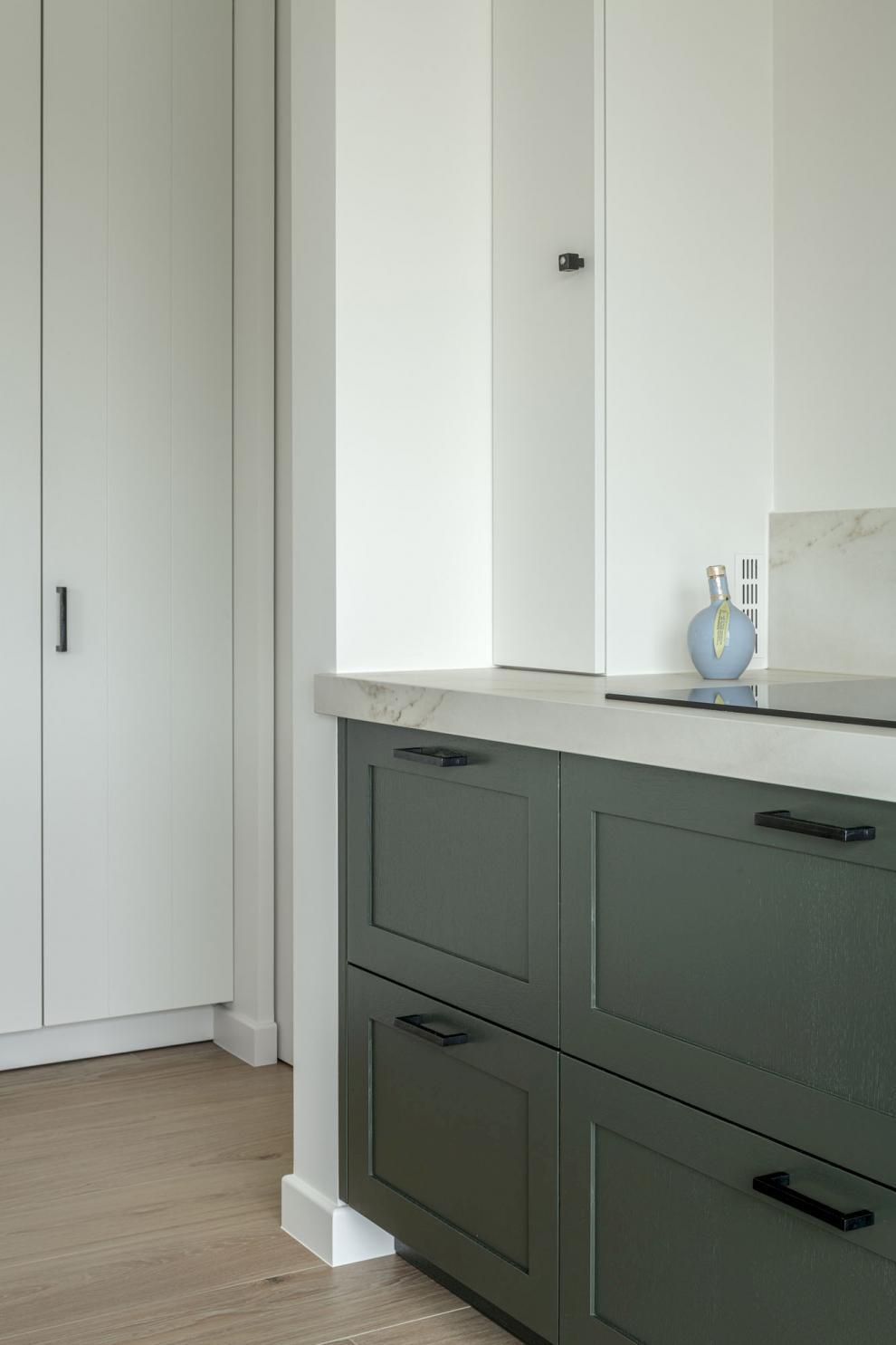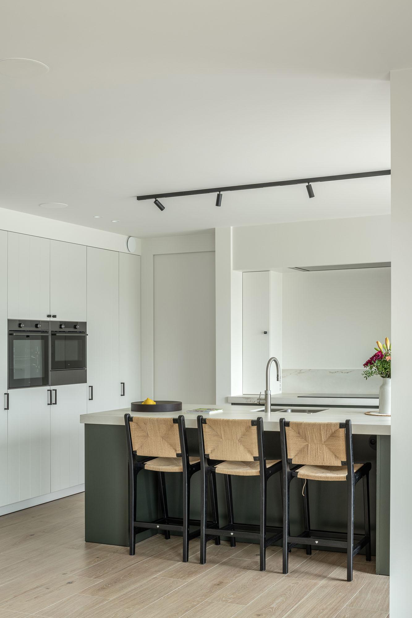 Elke ruimte heeft zijn eigen karakter, maar het geheel ademt een subtiele eenheid uit. De keuken speelt met diepgroen en warm grijs, met natuureik als basis. De maatkasten werden een combinatie van naturel eik en gelakt eik in een zachte aardetint. De badkamer combineert een warme Fenix-kleur met charmante tegels en een Corian wastafelblad.