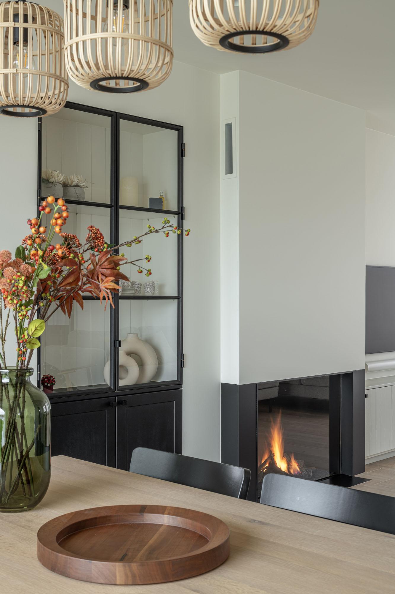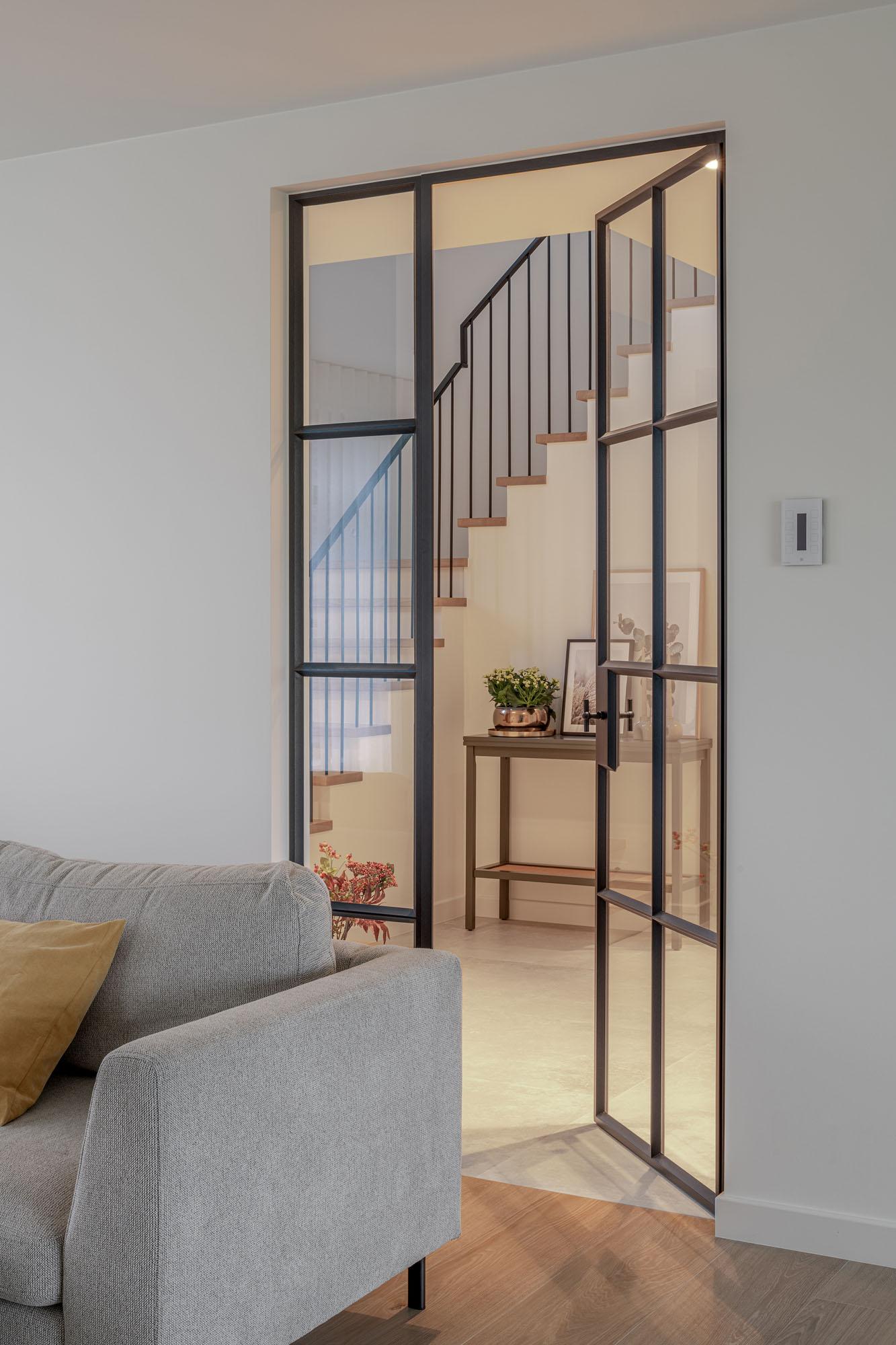 Aanvankelijk was er het idee om stalen deuren te plaatsen tussen het bureau en de woonkamer, net zoals in de gang, maar de keuze viel uiteindelijk op een volledig open verbinding. Het staal hebben we in de vitrinekasten en de haardwand verwerkt. Geen imitatie, maar echt ambachtelijk vervaardigd staal, met subtiele details zoals de fijne scharniertjes en het in mastiek ingezet glas.