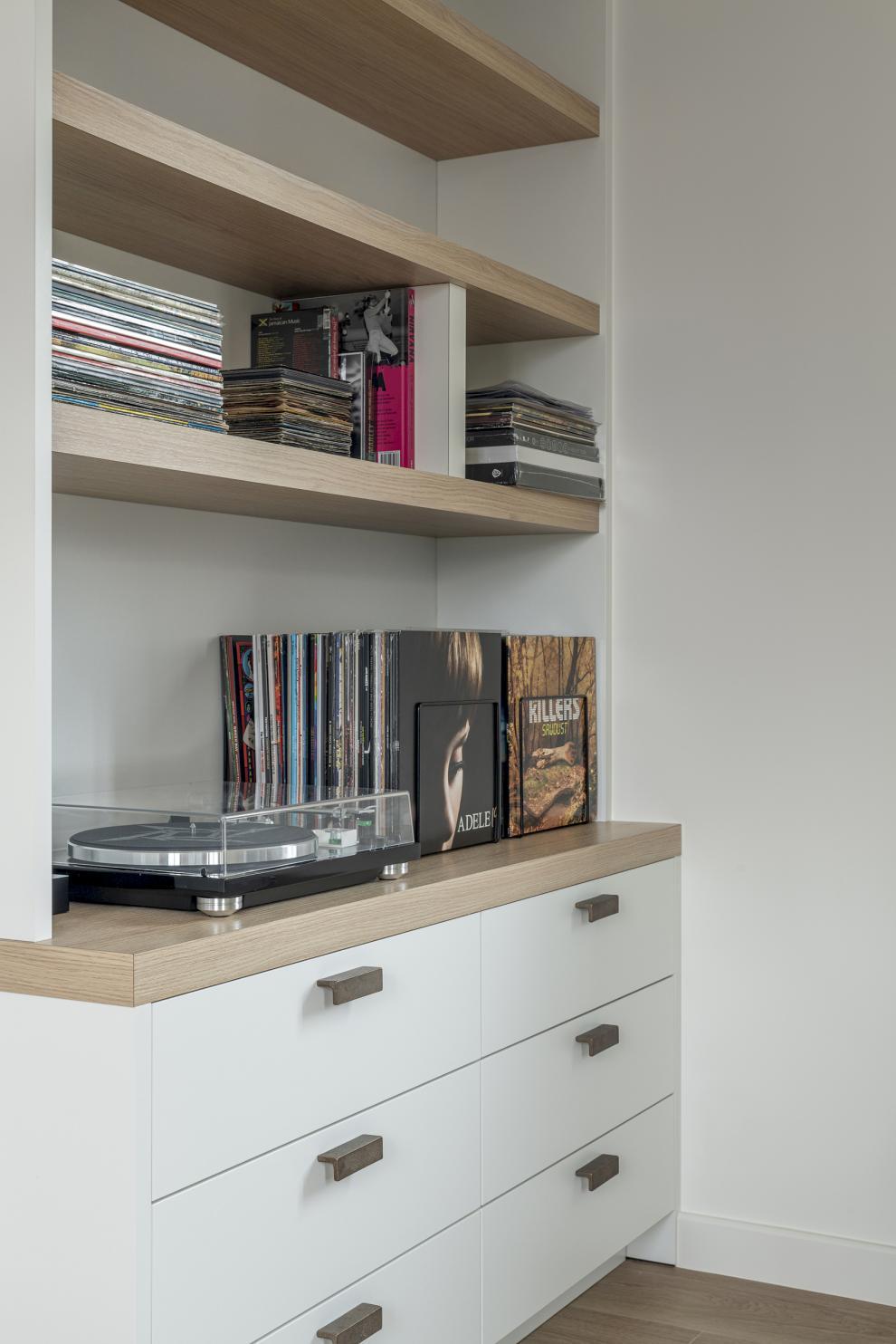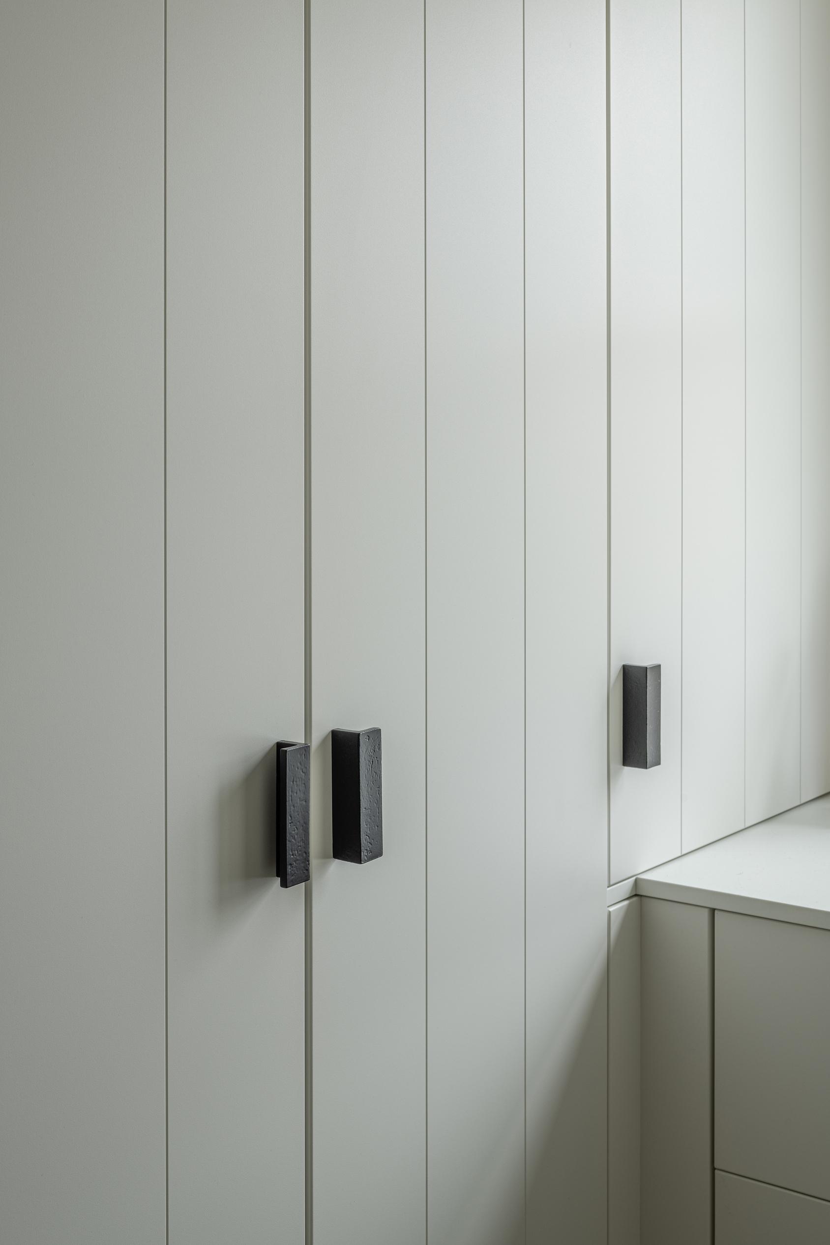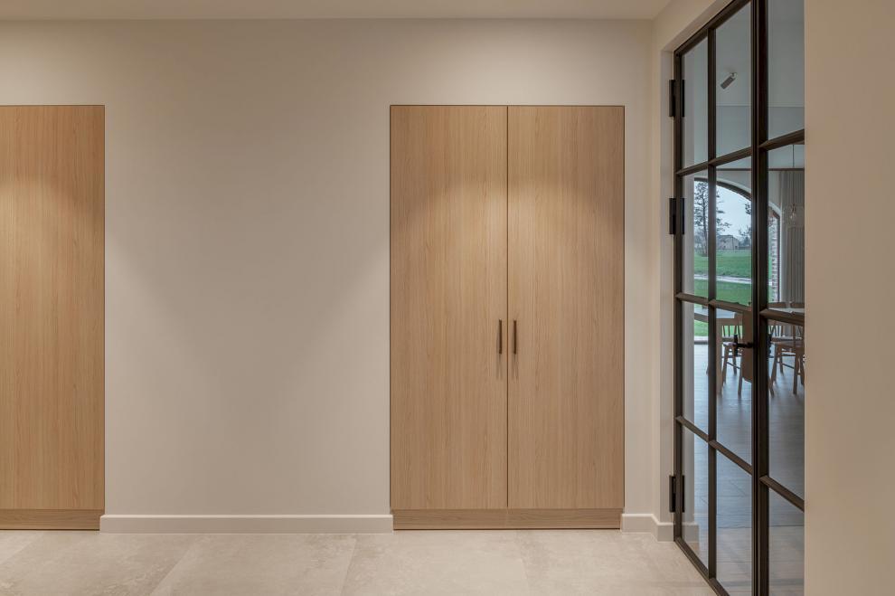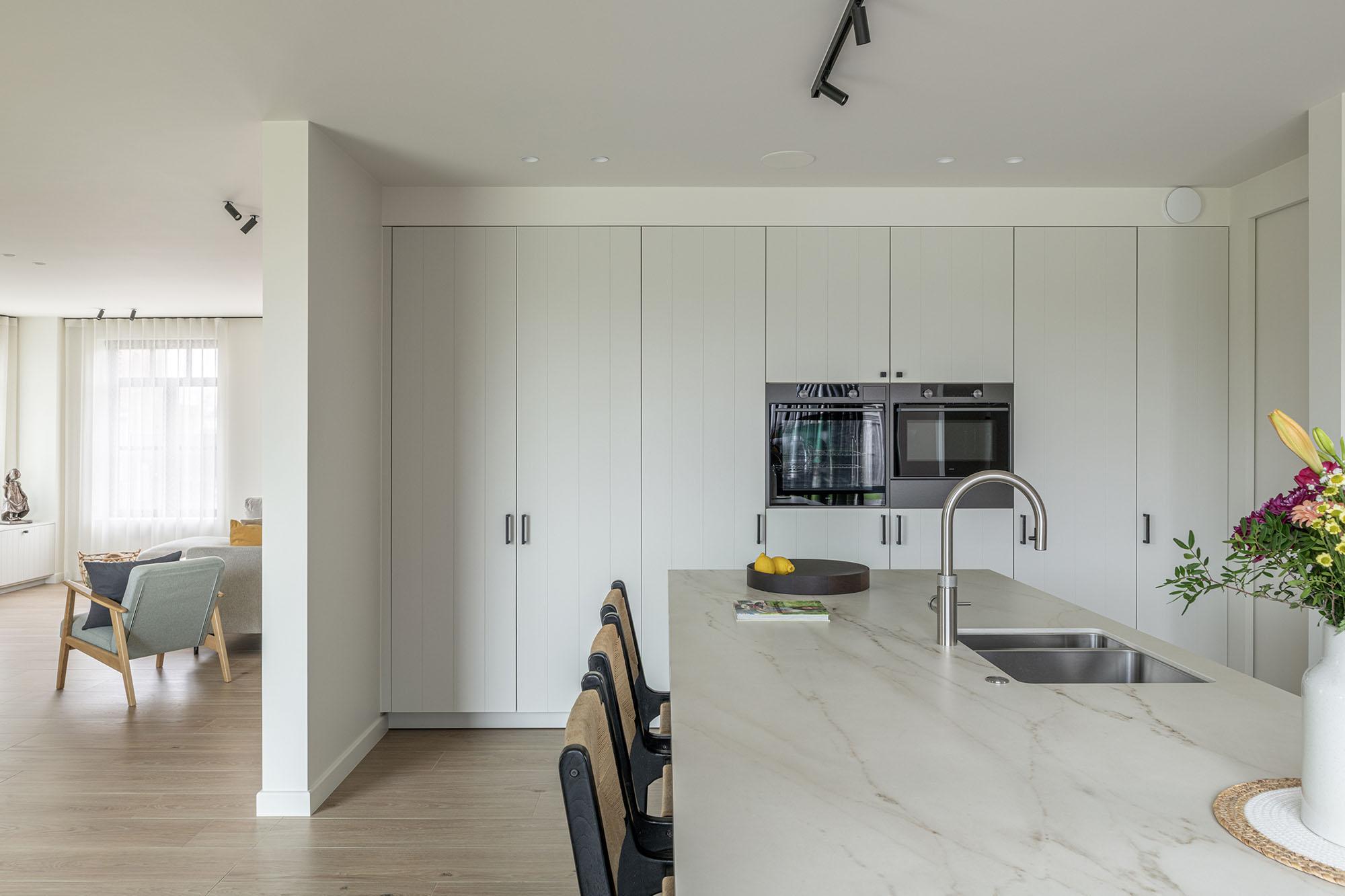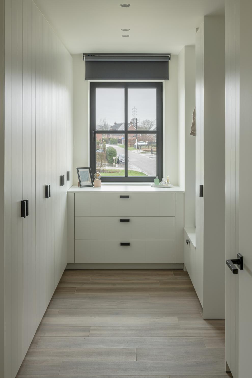 Het huis was in ruwbouw, maar de ruimtes waren nog niet af. Slimme ingrepen, zoals schuifdeuren en kastwanden, zorgden voor een praktische en esthetische indeling. In de keuken werden diepe en minder diepe kasten gebruikt om technische elementen zoals collectoren toegankelijk te houden, zonder in te boeten op de uitstraling.