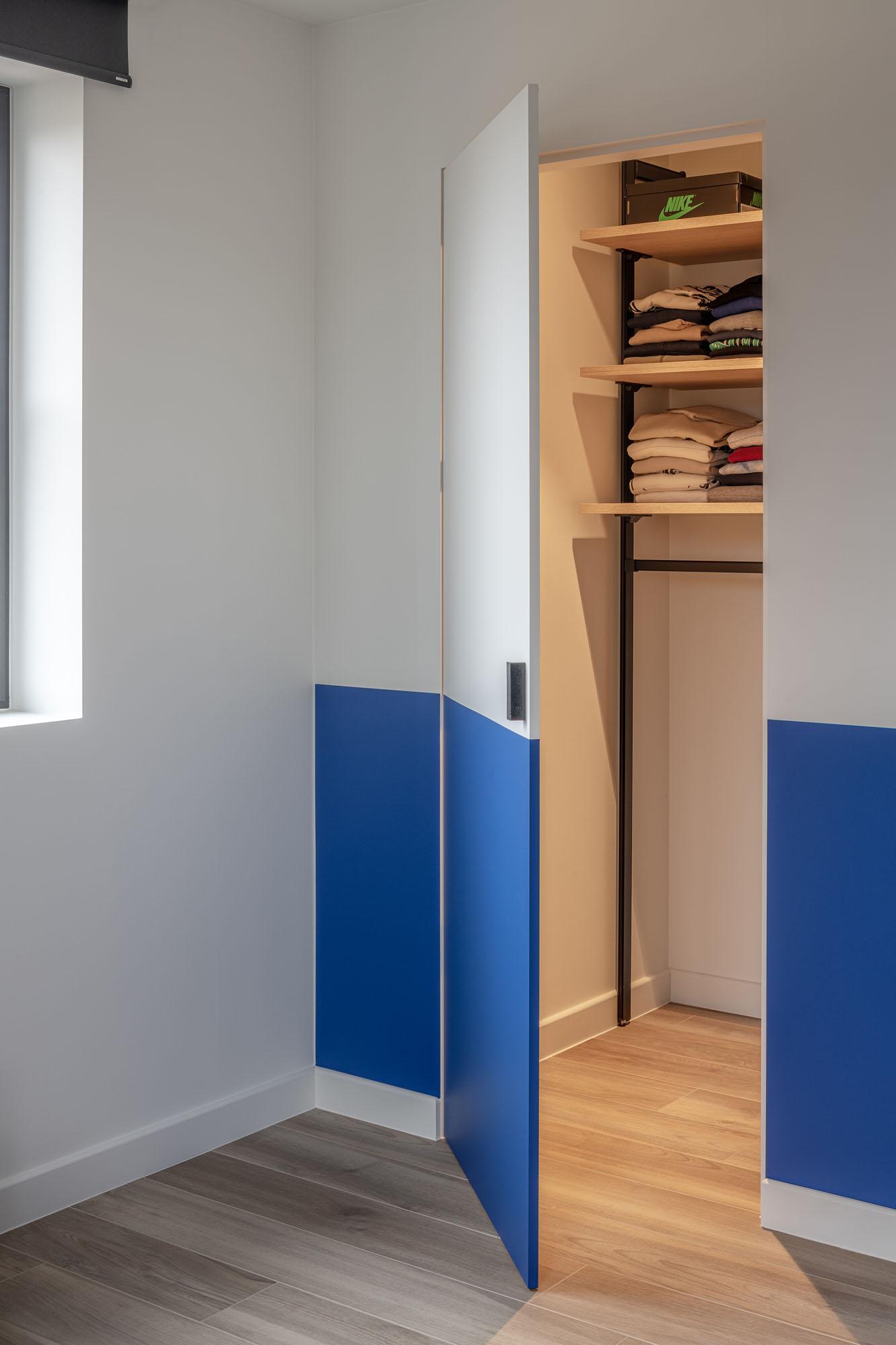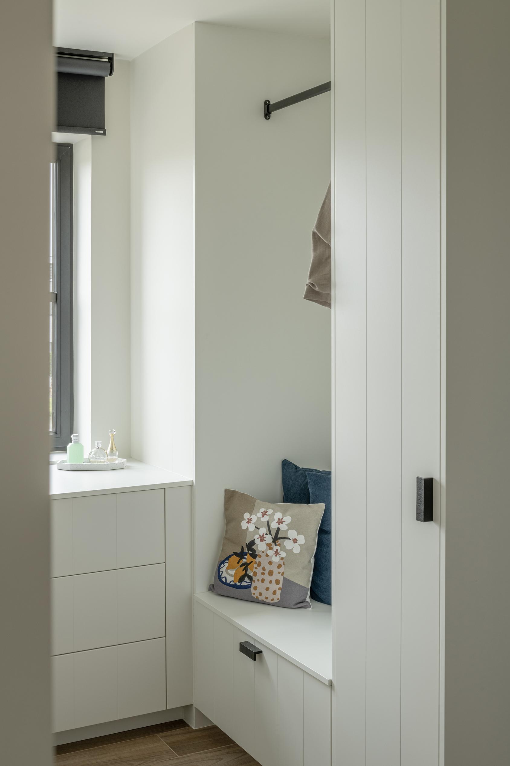 De slaapkamers kregen een slimme indeling, met aparte kamers voor de kinderen en een dressing die later omgebouwd kan worden tot een badkamer. Het bureau op de benedenverdieping is een multifunctionele ruimte die eenvoudig aangepast kan worden naarmate het gezin groeit.
