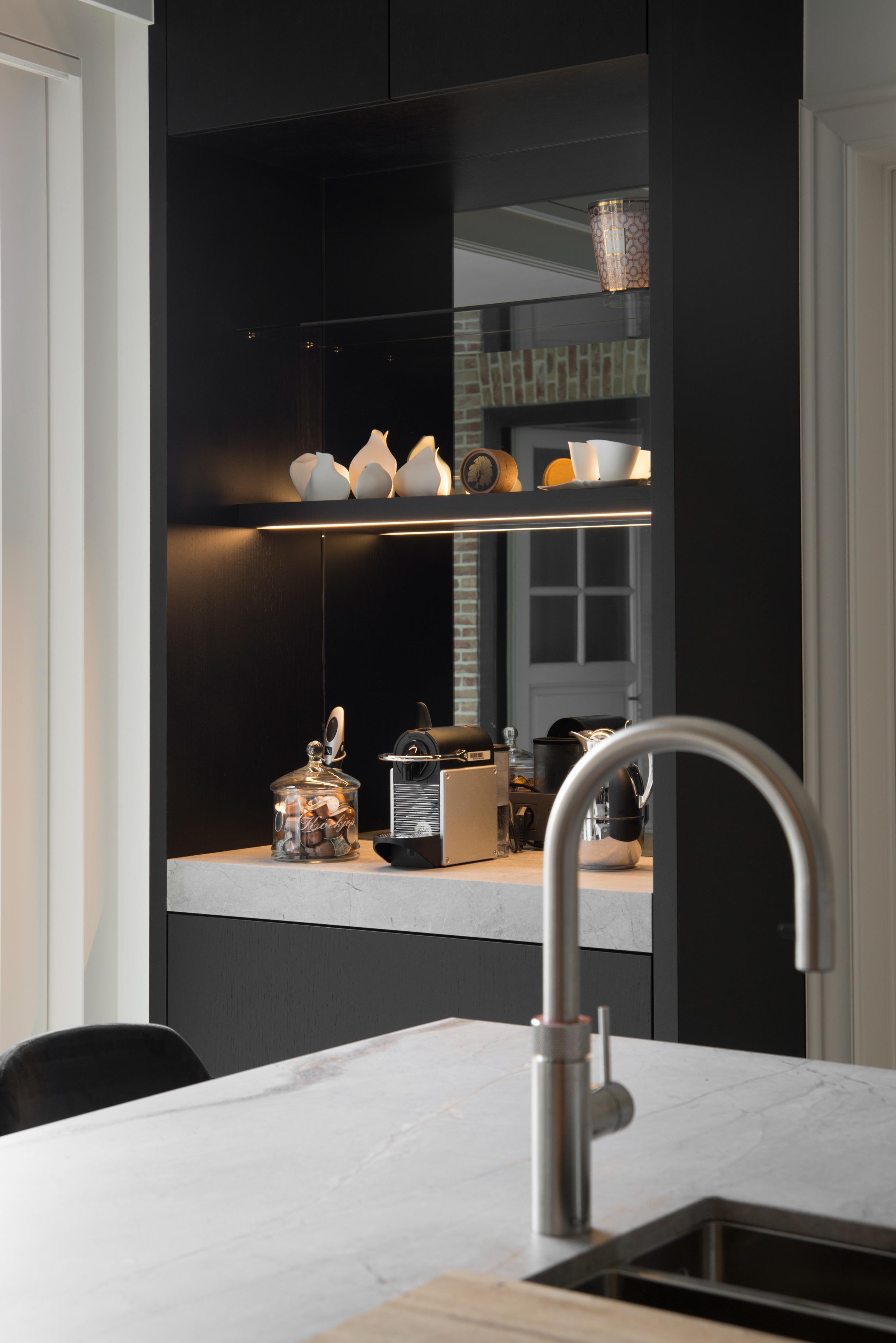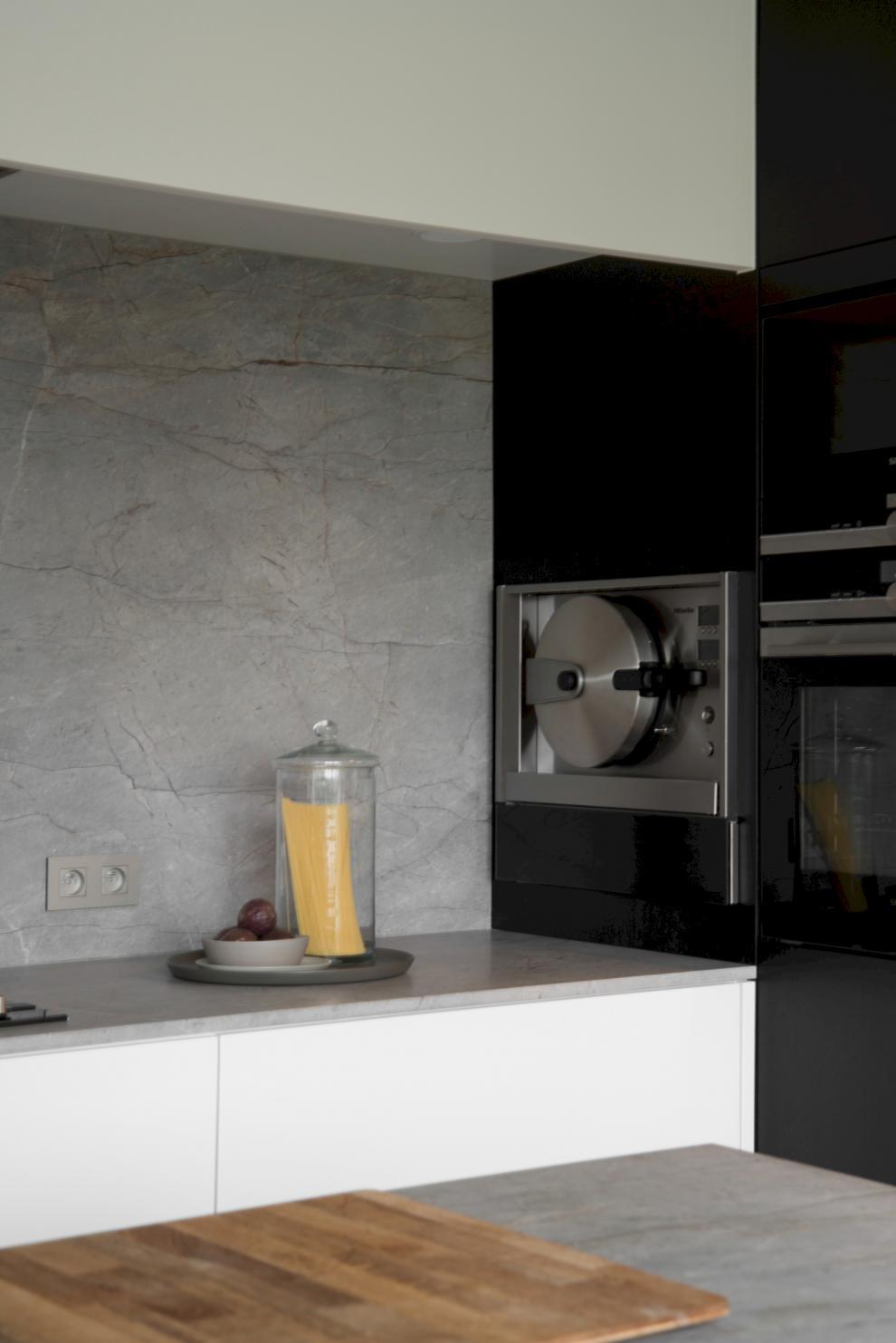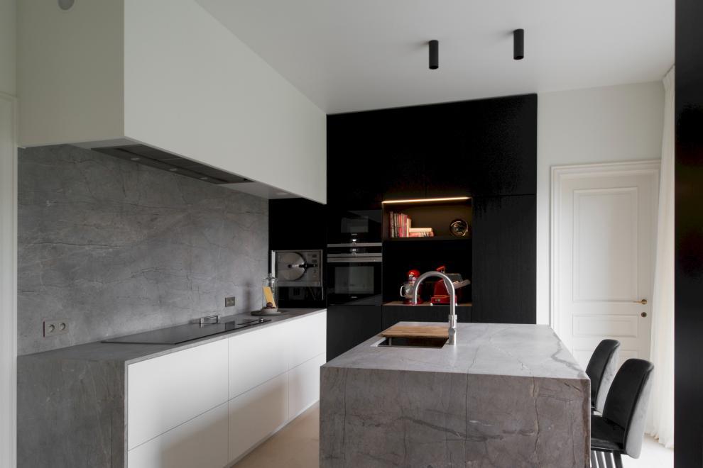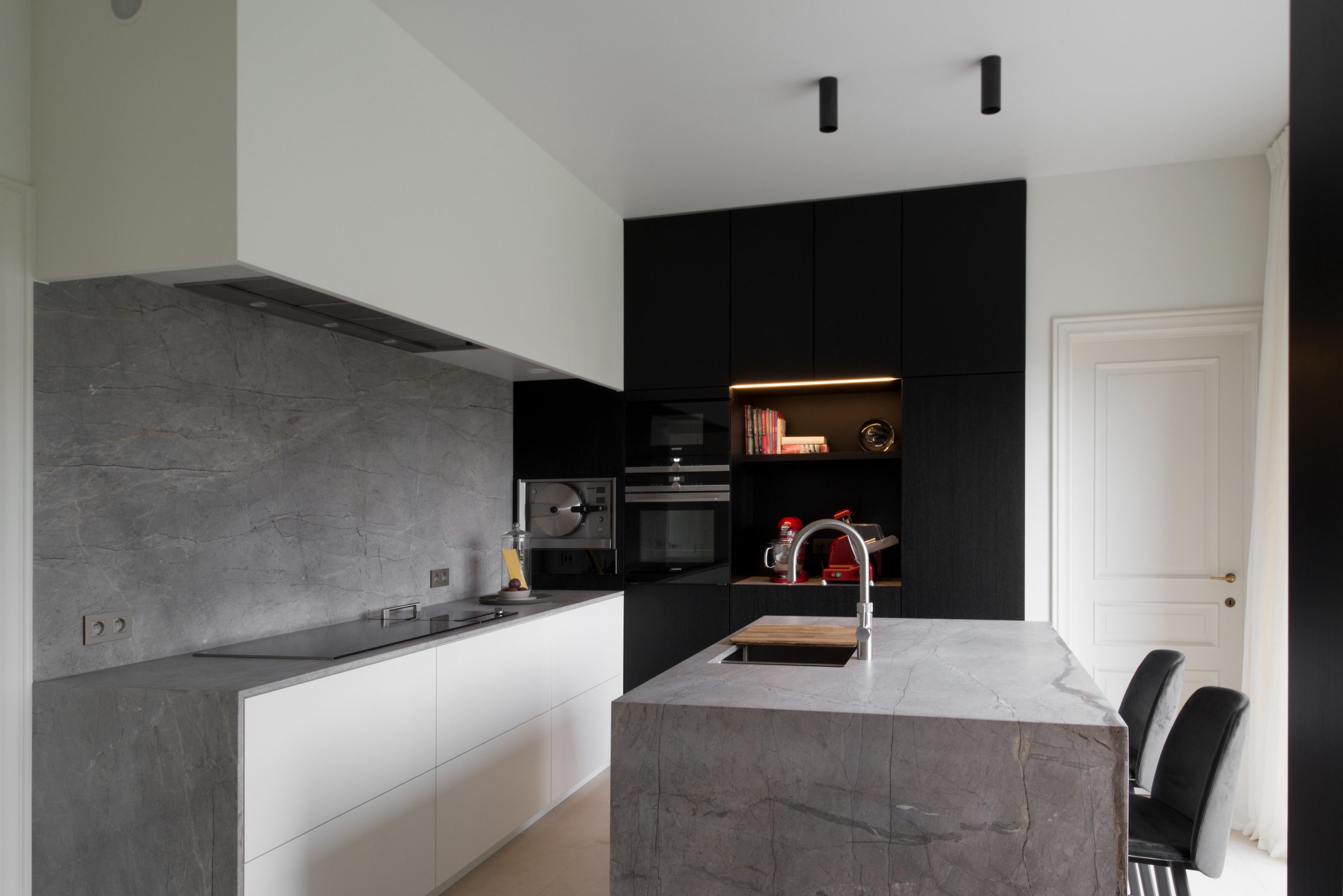 Minimalistisch, maar krachtig. De witte afwerking van deze keuken wordt versterkt door donkere accenten, wat zorgt voor een eigentijdse, gedurfde uitstraling die de ruimte definieert.