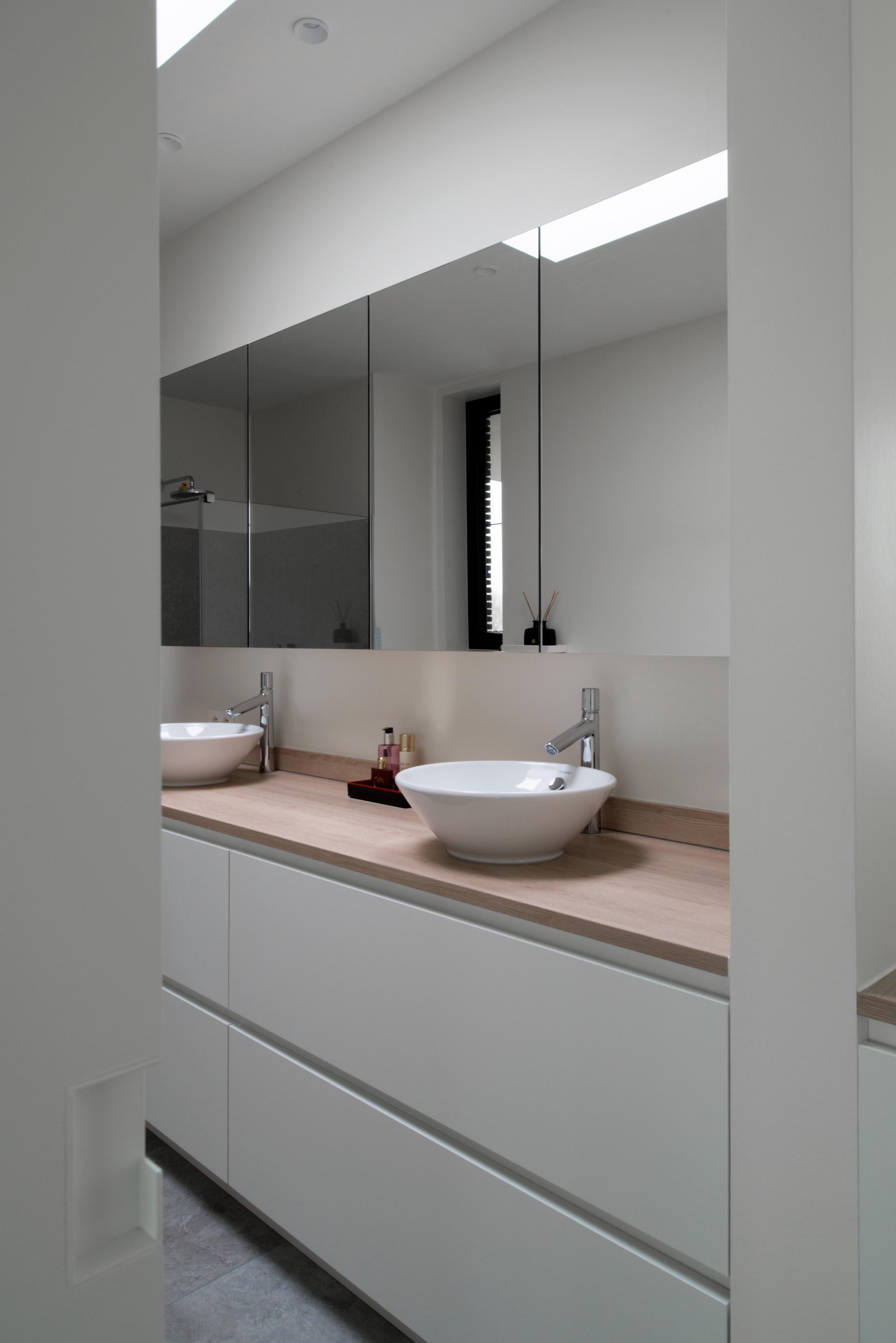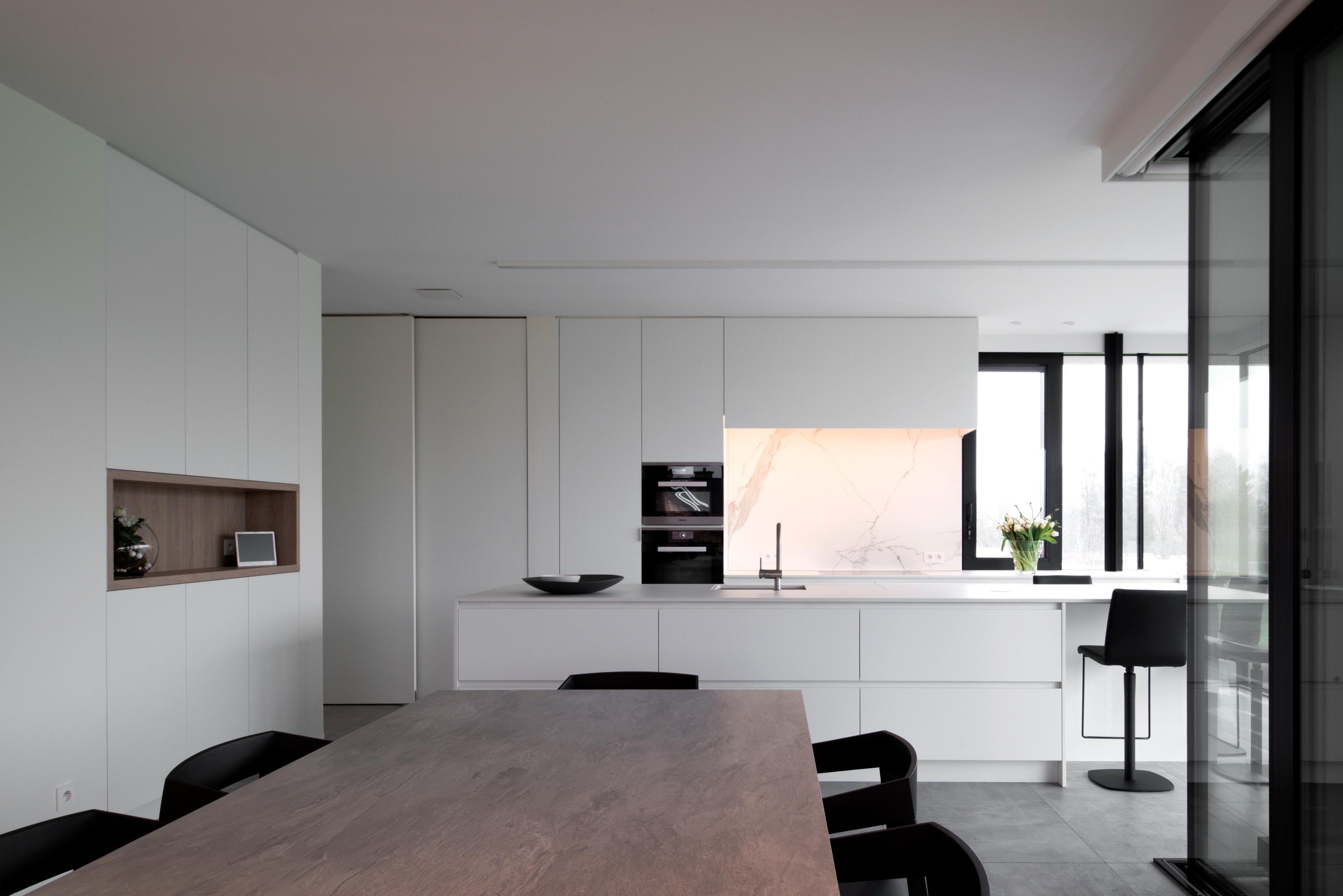 Een frisse, moderne uitstraling. Het lichte kleurenschema wordt geaccentueerd door natuurlijke houtaccenten, wat zorgt voor een tijdloze keuken met een warme, eigentijdse twist.