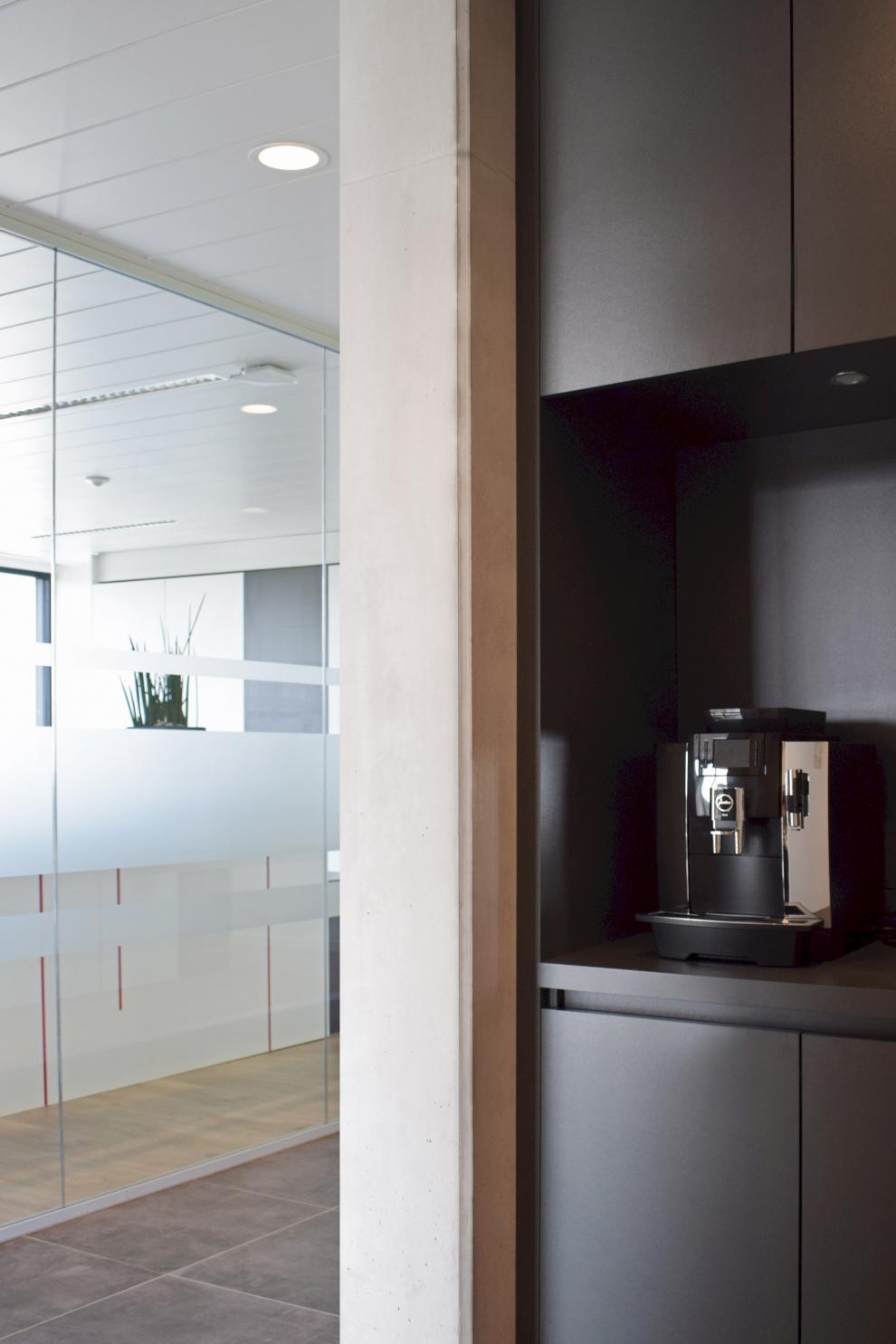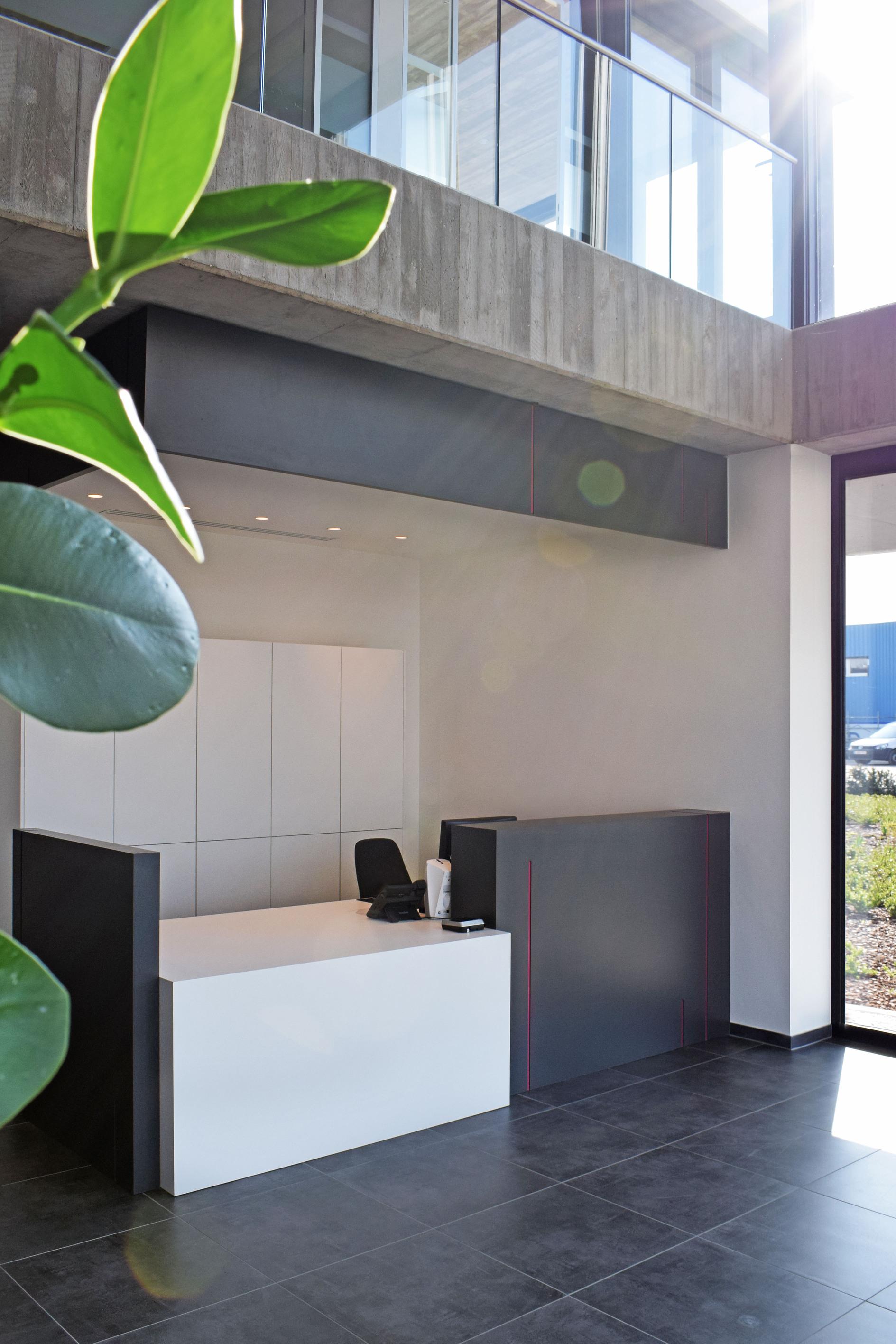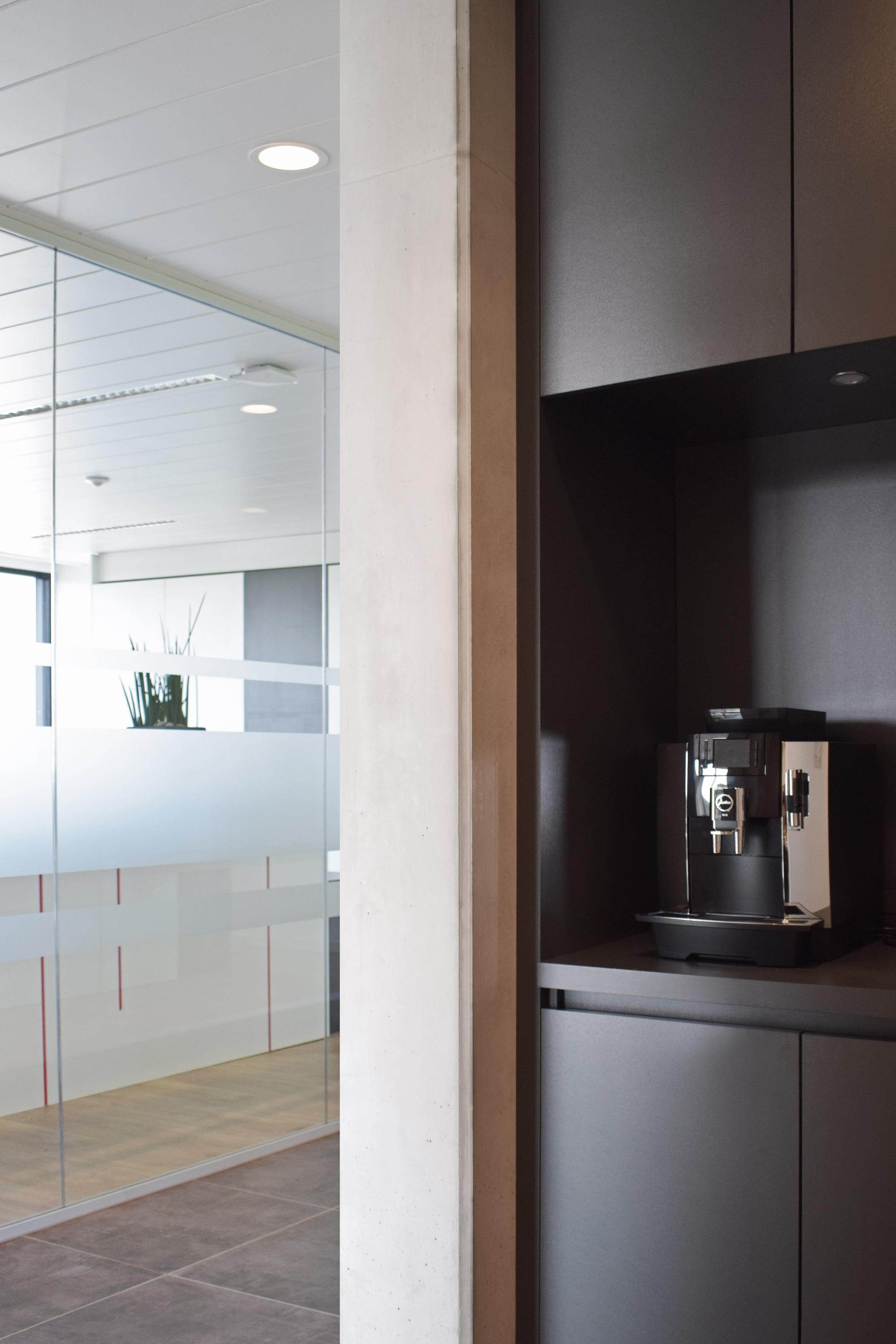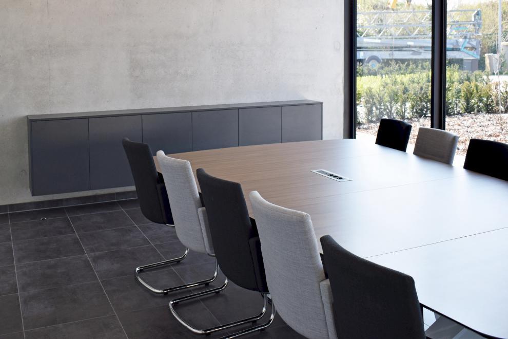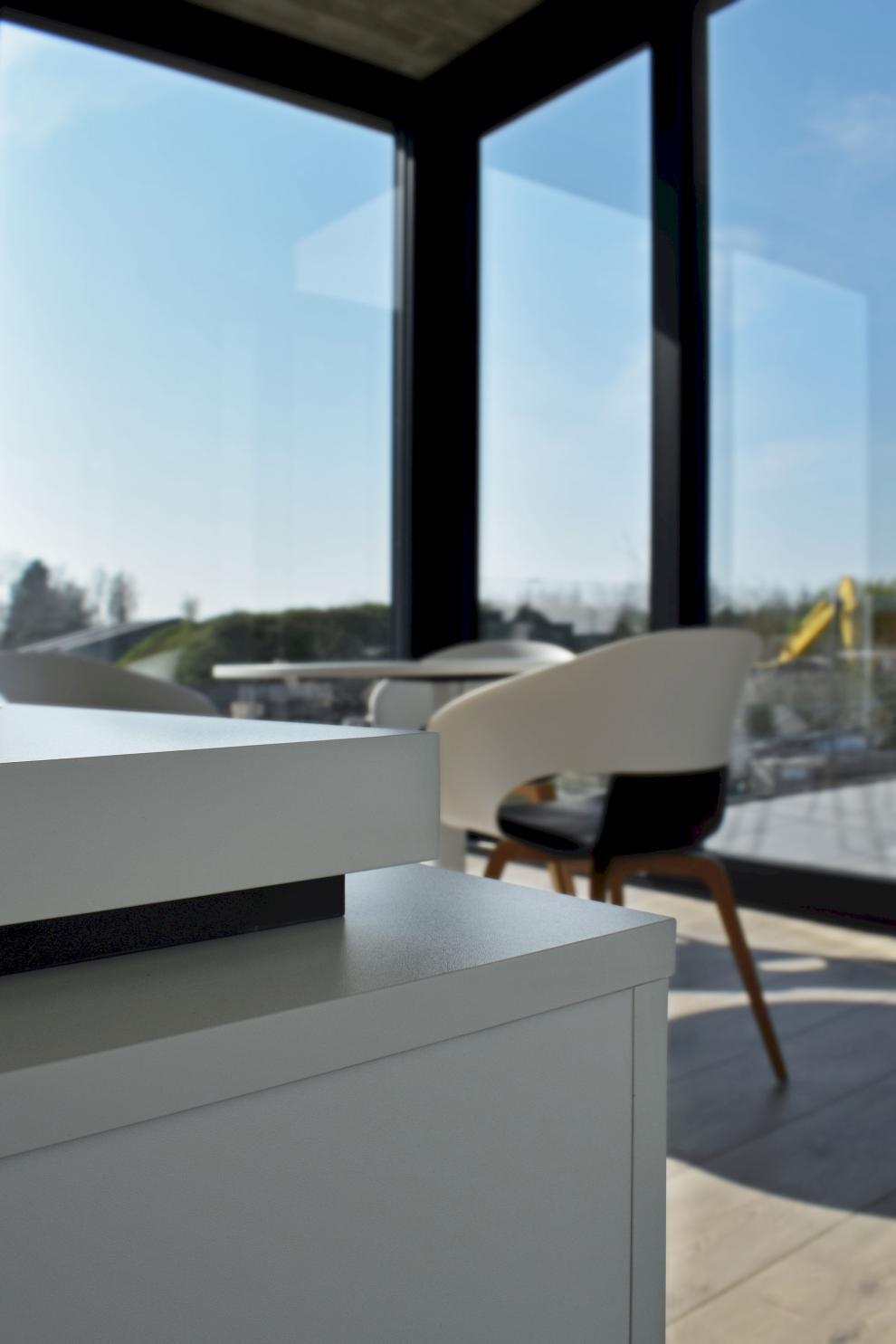 De ruimte straalt een industriële charme uit. Beton, wit en grijs bieden een minimalistische, maar krachtige uitstraling. De muren in beton vormen de basis van het ontwerp en zorgen voor een robuust karakter. Ze verwijzen subtiel naar de vloerbekisting die het bedrijf zelf toepast, wat een mooie aansluiting biedt tussen het interieur en de bedrijfsactiviteiten.