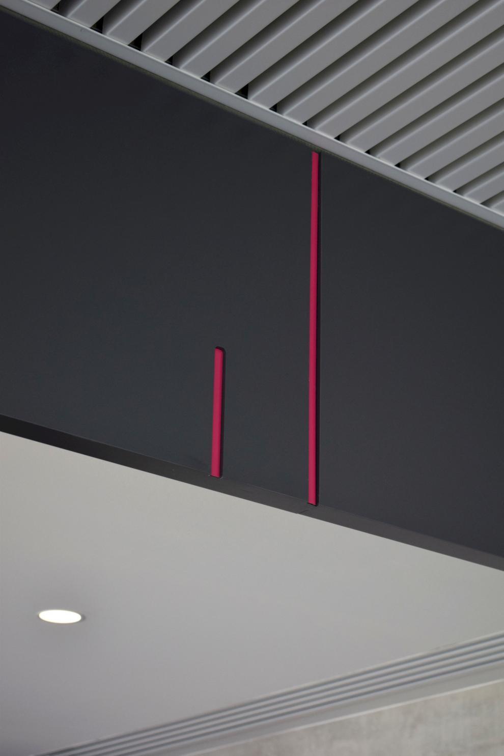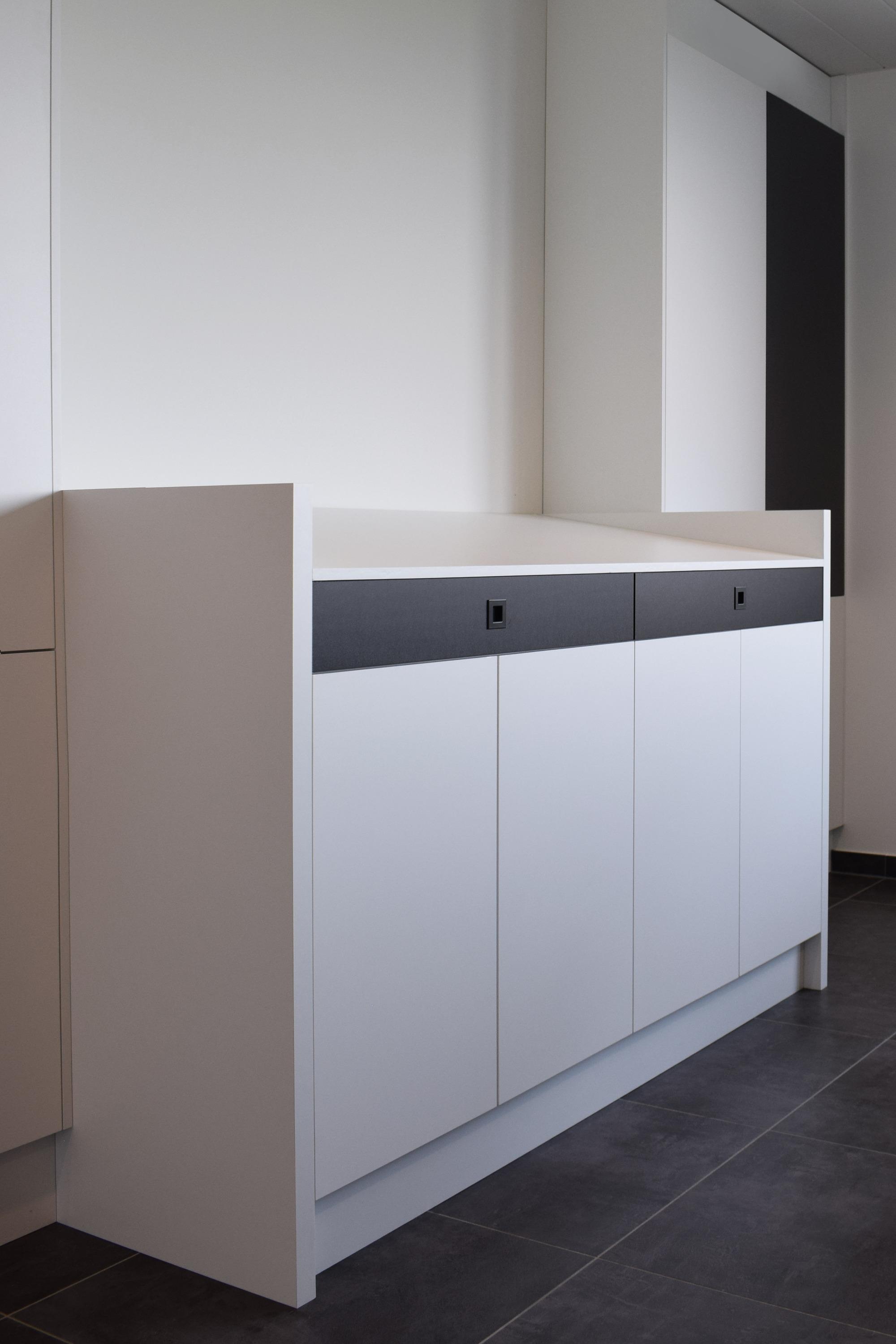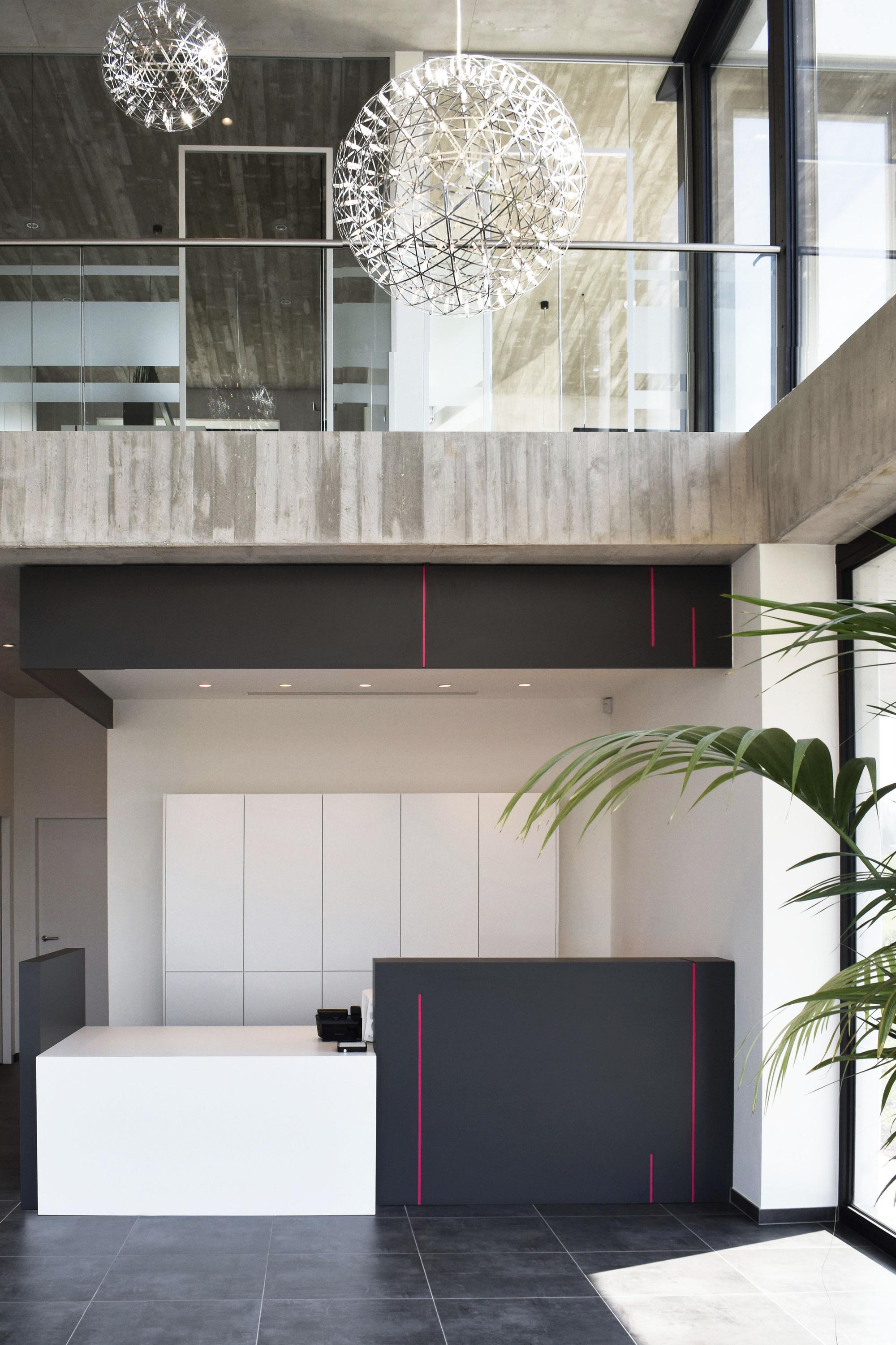 Het concept is zorgvuldig afgestemd op de eigen huisstijl, waarbij het bedrijfslogo subtiel door het interieur heen is verwerkt. Roze accenten, vervaardigd uit structuurlak, breken het minimalistische wit en grijs van het meubilair. Deze speelse kleurdetails versterken de professionele uitstraling en verbinden de visuele identiteit van het bedrijf met de ruimte. Het resultaat is een kantoor dat zowel de merkidentiteit uitstraalt als de productiviteit en samenwerking bevordert.