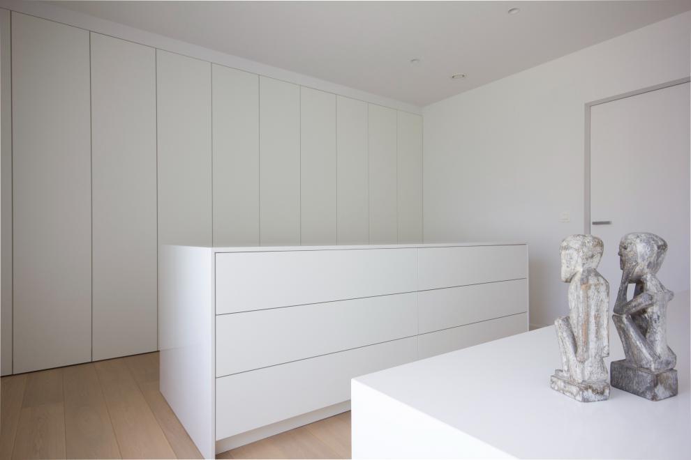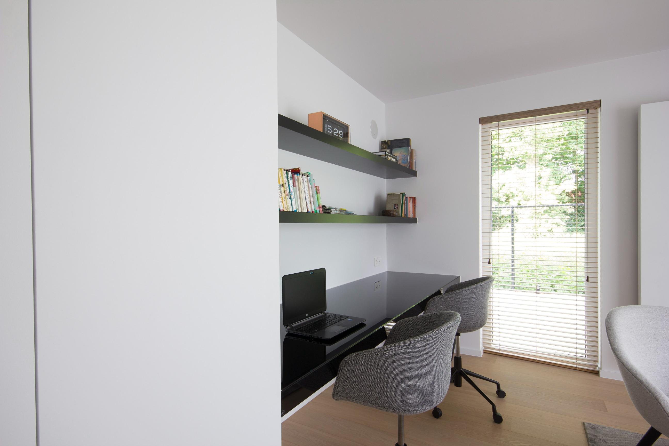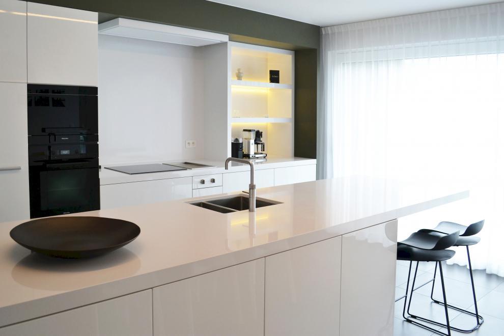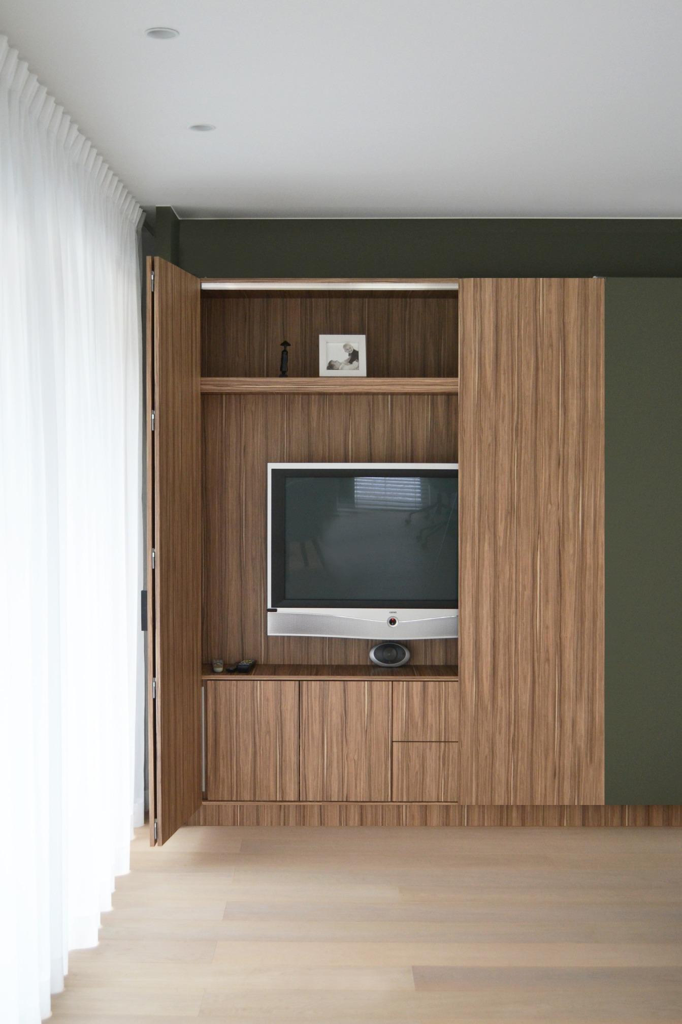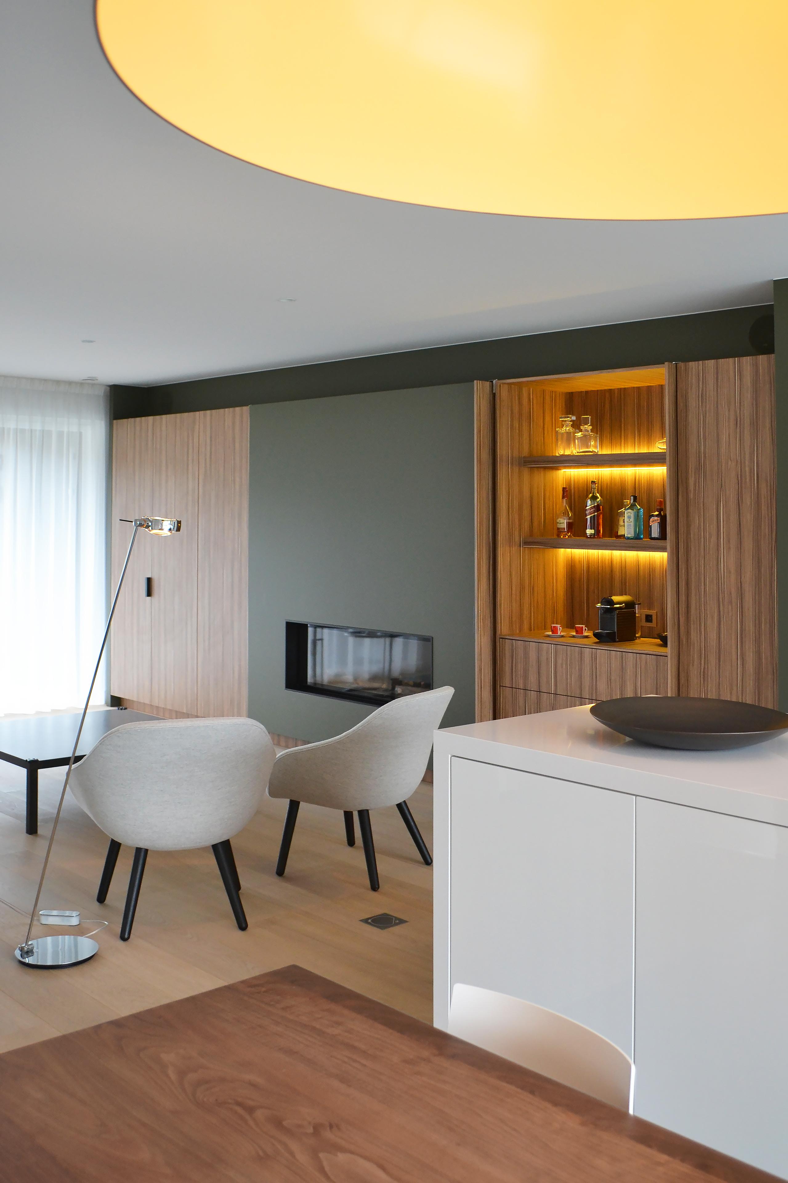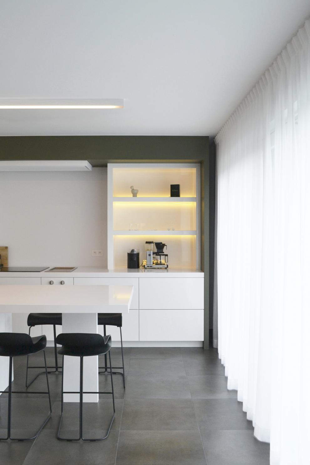 De groene kleur vormt een warm contrast met de natuurlijke houttinten en subtiele texturen. Dit ontwerp brengt rust en verfijning samen.