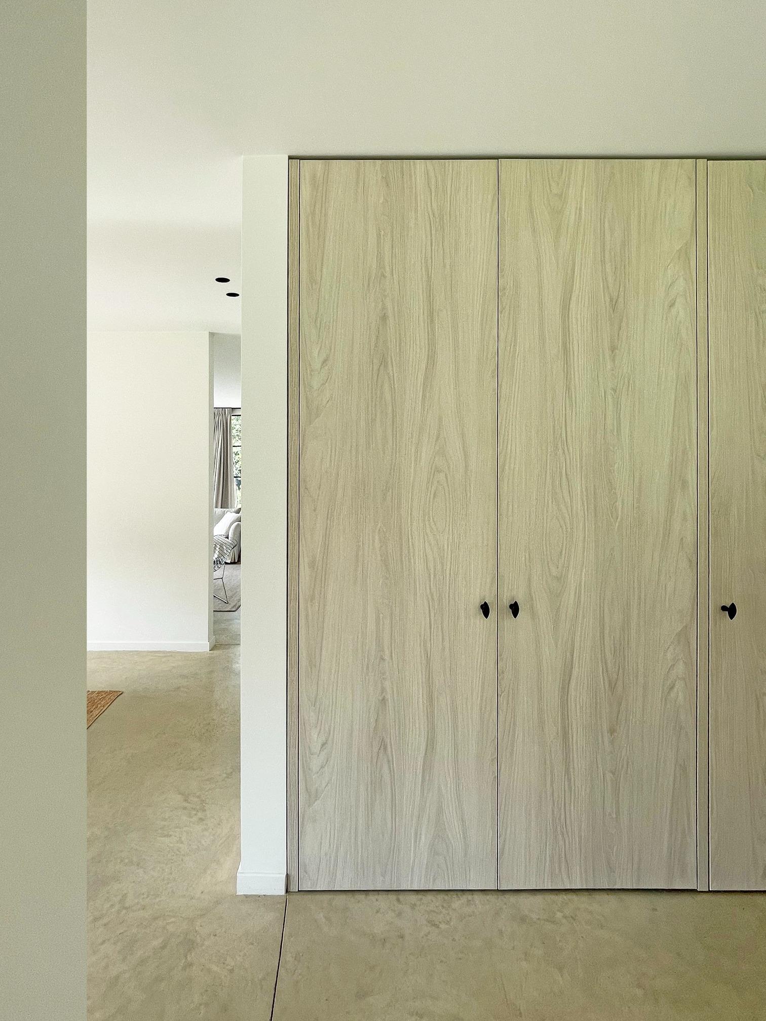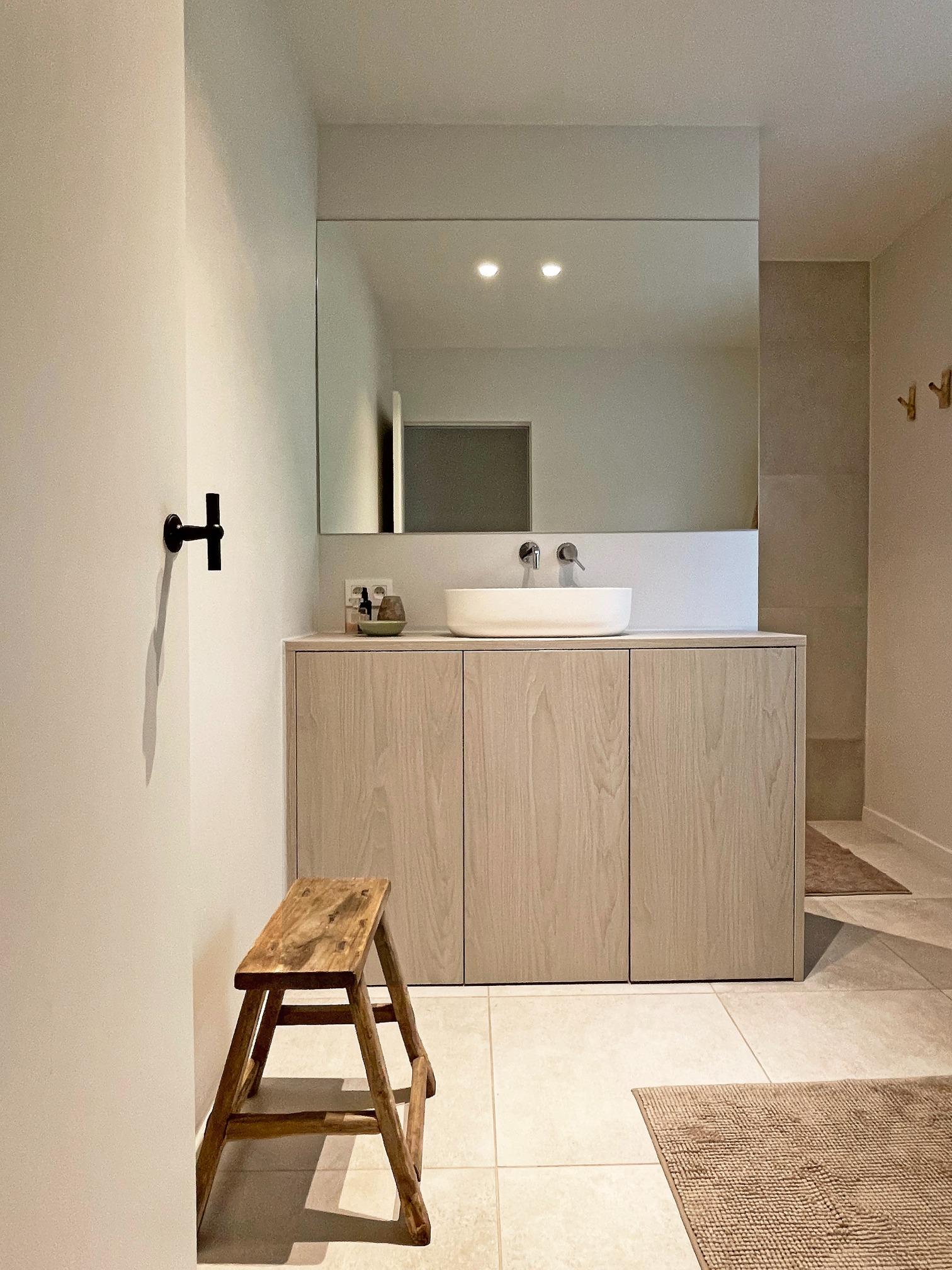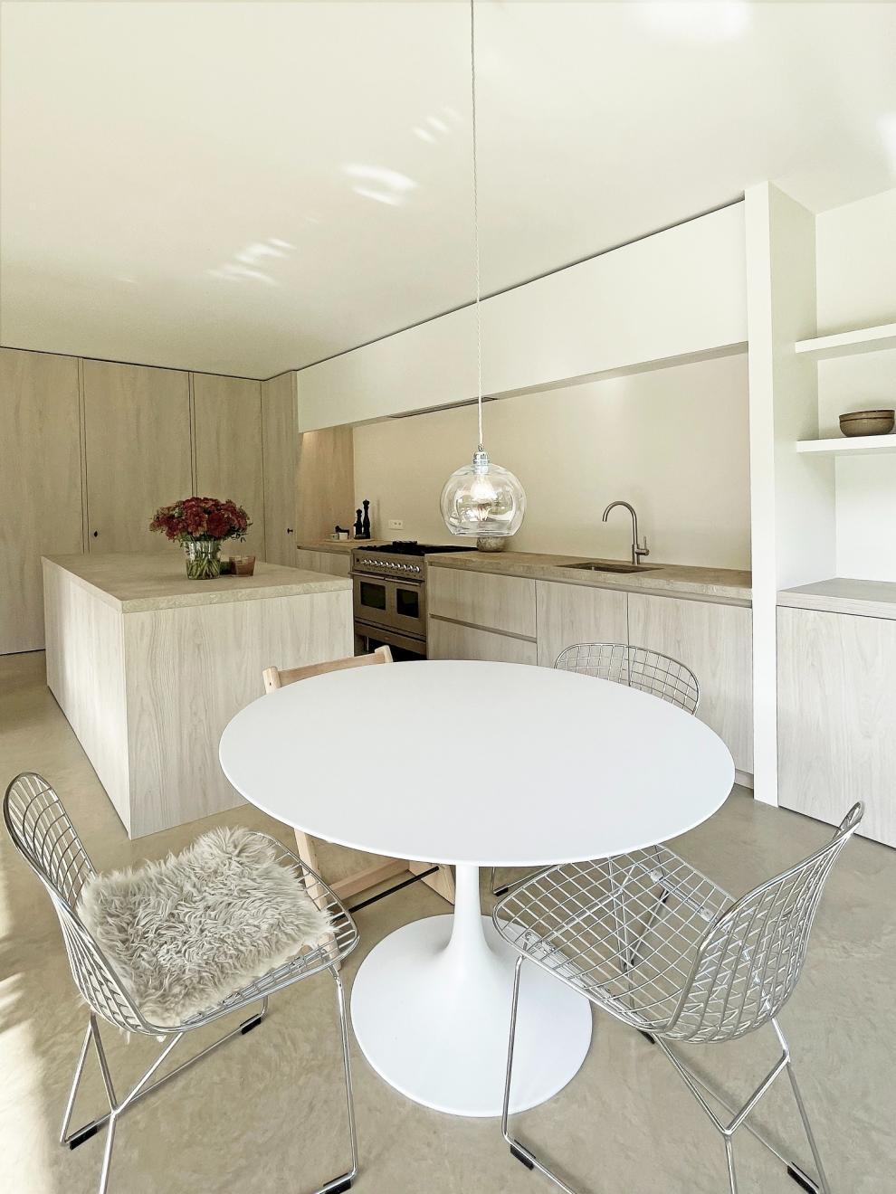 Deze keuken combineert lichte tinten met een warme houten afwerking, waardoor een moderne, uitnodigende sfeer ontstaat.