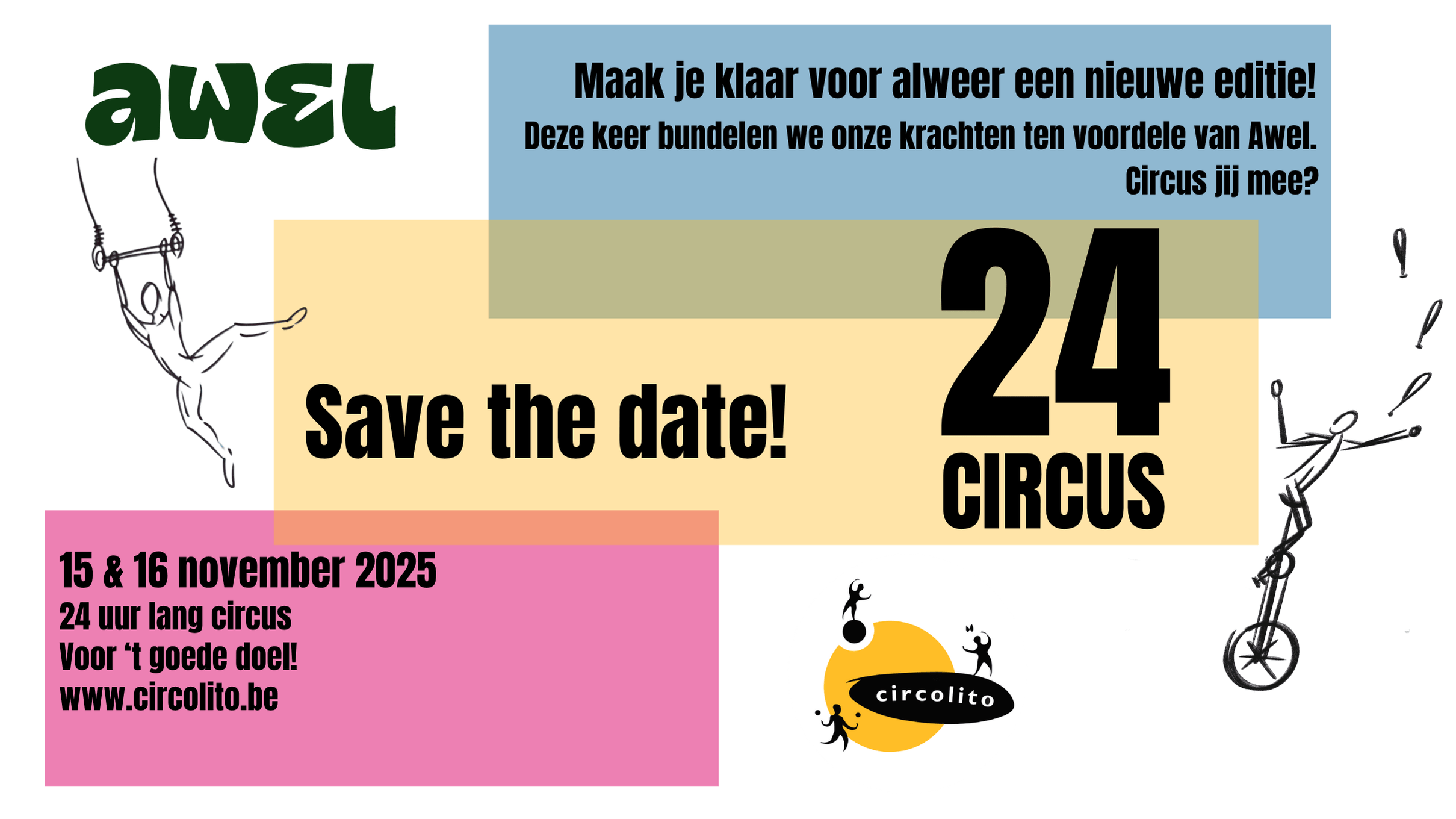 Op zaterdag 15 november, vanaf 17u, tot zondag 16 november, 17u, gaan we non-stop circussen bij Circolito in Mechelen. We willen zo geld verzamelen voor 'Awel'.