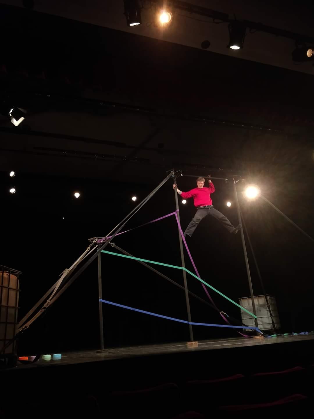 De voorstelling combineert een conference met een circusact. Hij had het met ons over ons wereldbeeld.