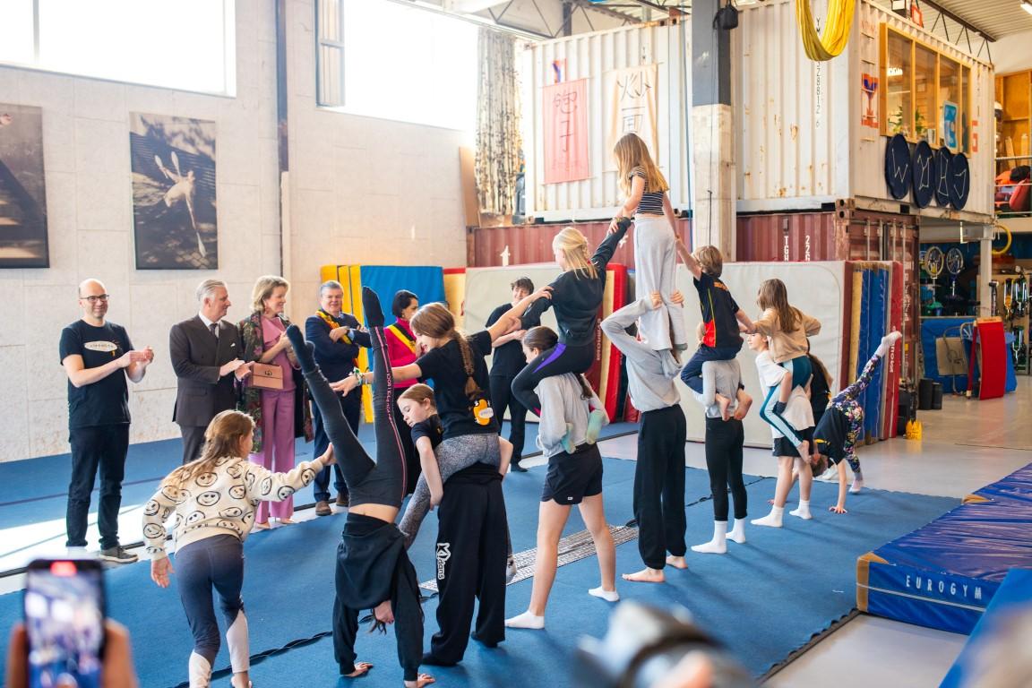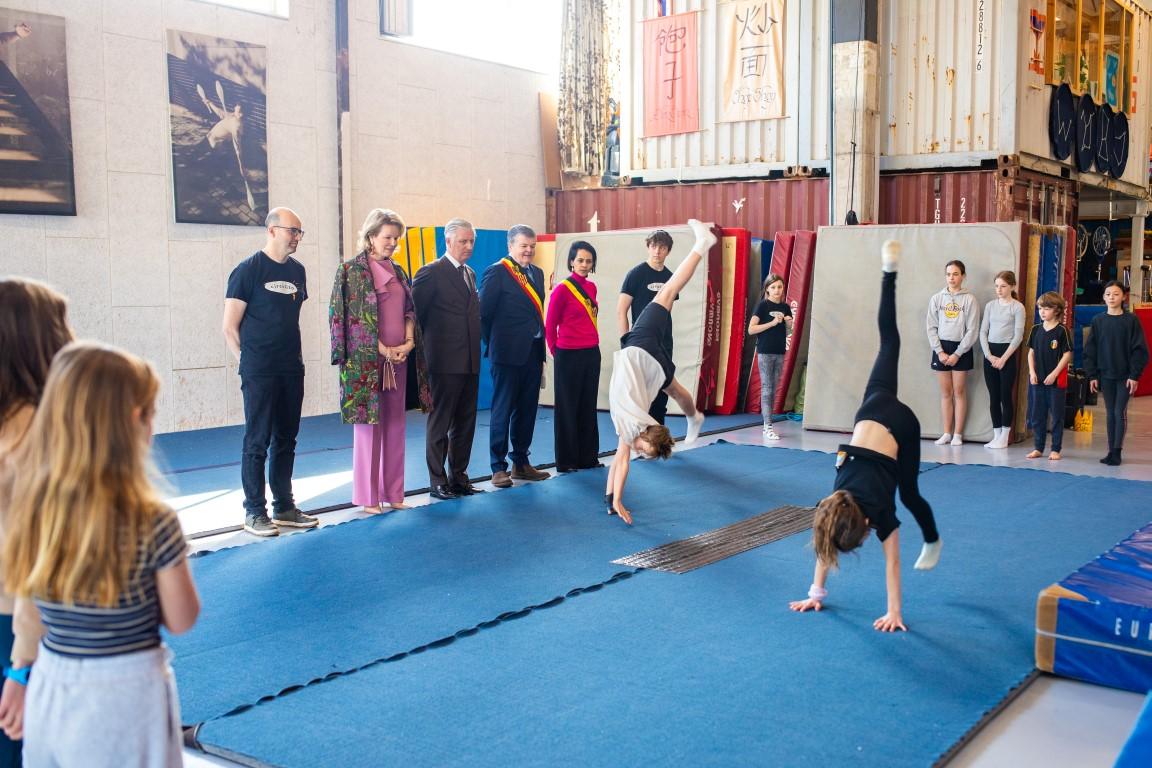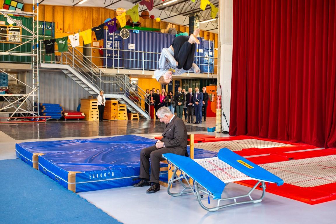 De acrobaten van de acro4daagse hadden op maandag een korte demonstratie voorbereid. Naast trampoline-oefeningen en piramides zou Sara ook een salto maken over het hoofd van 'een bezoeker'. Ze hoopten stiekem dat de koning de vrijwilliger zou zijn, maar ze beseften dat die kans wel erg klein was. Plan B was burgemeester Bart Somer, en als die het ook niet zou zien zitten, dan werd voorzitter Dieter de 'Chinese vrijwilliger'. Maar kijk, het was wel degelijk koning Filip die meteen op de stoel ging zitten, al besefte hij vooraf misschien niet helemaal wat er zou gebeuren. De salto over de koning werd natuurlijk hét hoogtepunt van het bezoek voor de journalisten die er bij waren!