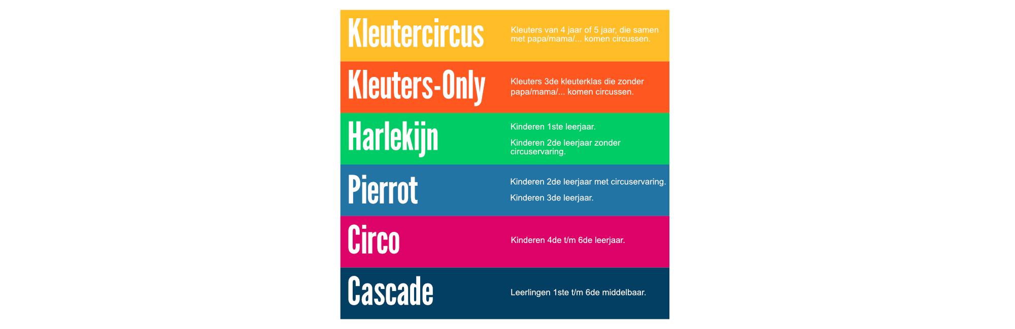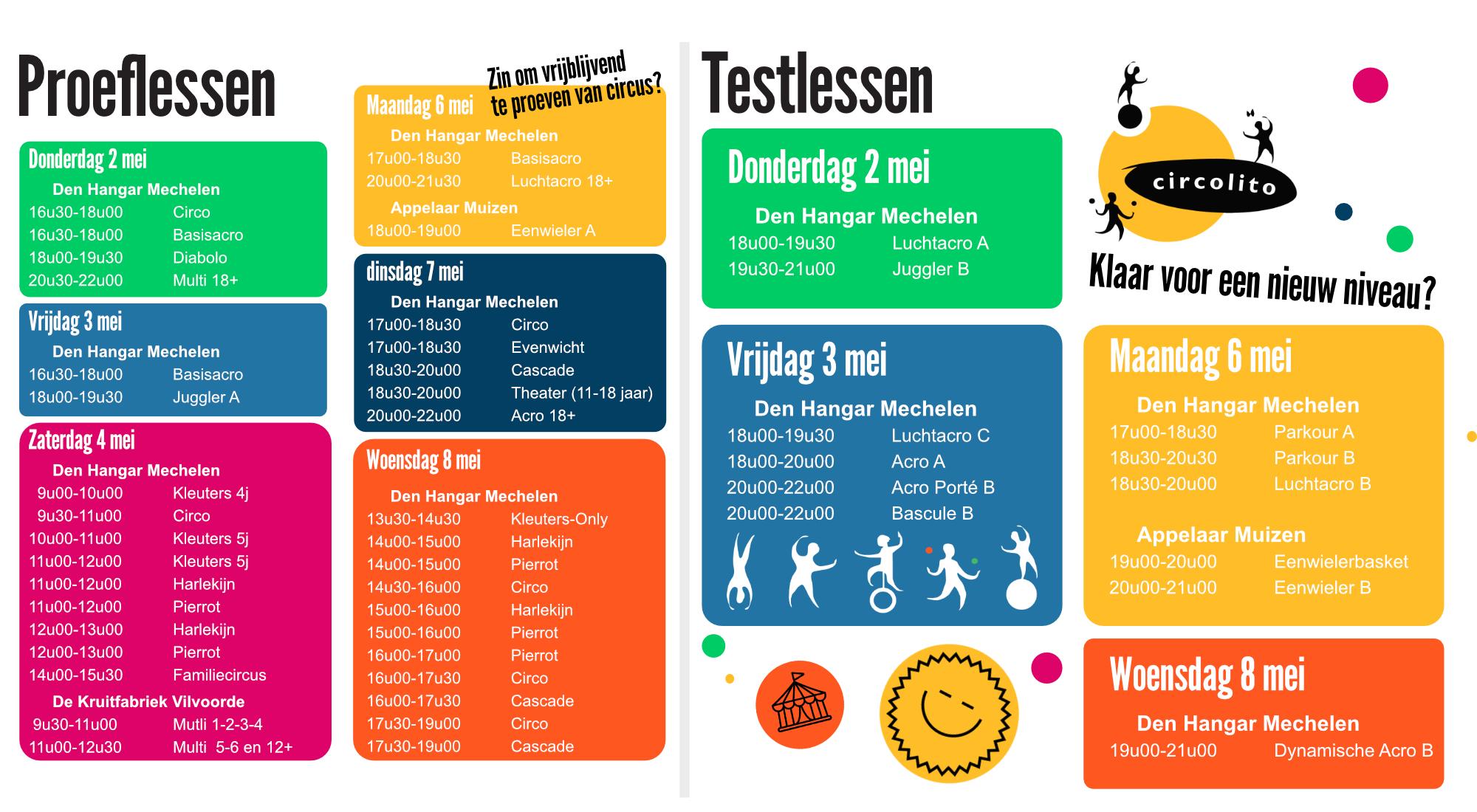 Dag Circolito’s en toekomstige Circolito's! Wil jij een keertje vrijblijvend komen proeven van een circusles? Kom dan naar een gratis proefles! Wil jij als Circolito een niveau stijgen of je verder specialiseren? Dan moet je eerst een testles volgen. Je hoeft je voor de proef- en testlessen niet in te schrijven. Kom gewoon naar de juiste les! Hieronder vind je het rooster van de proef- en testlessenweek en een overzicht van de leeftijdsgroepen van de lessen in Mechelen. Wat Mechelen betreft: het lessenrooster voor 2024-2025 gaat (zo goed als) identiek zijn aan het lessenrooster van dit jaar.