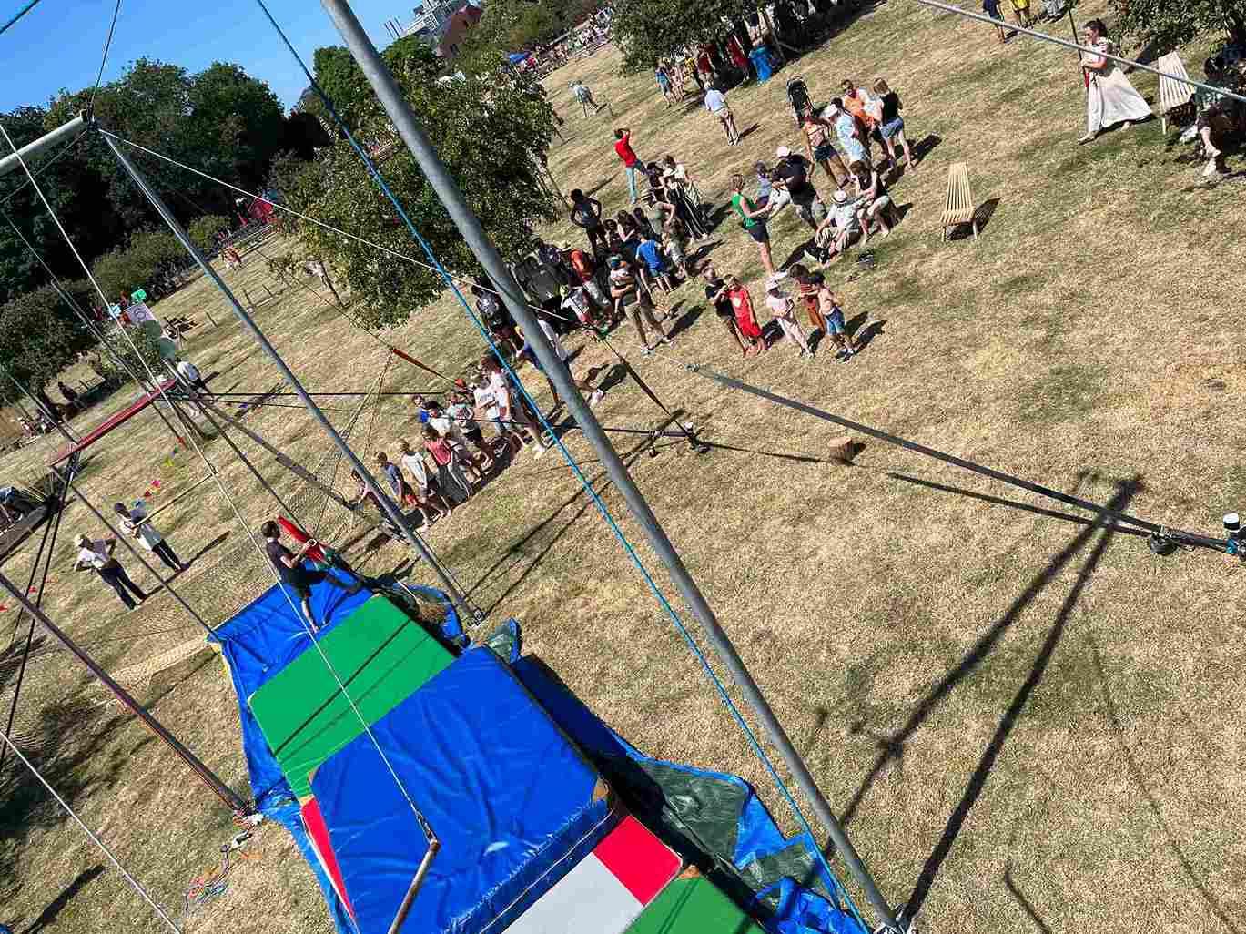Het plezier spat ervan af wanneer de FFFers hun publiek uitnodigen om zelf vliegende trapeze te komen doen.