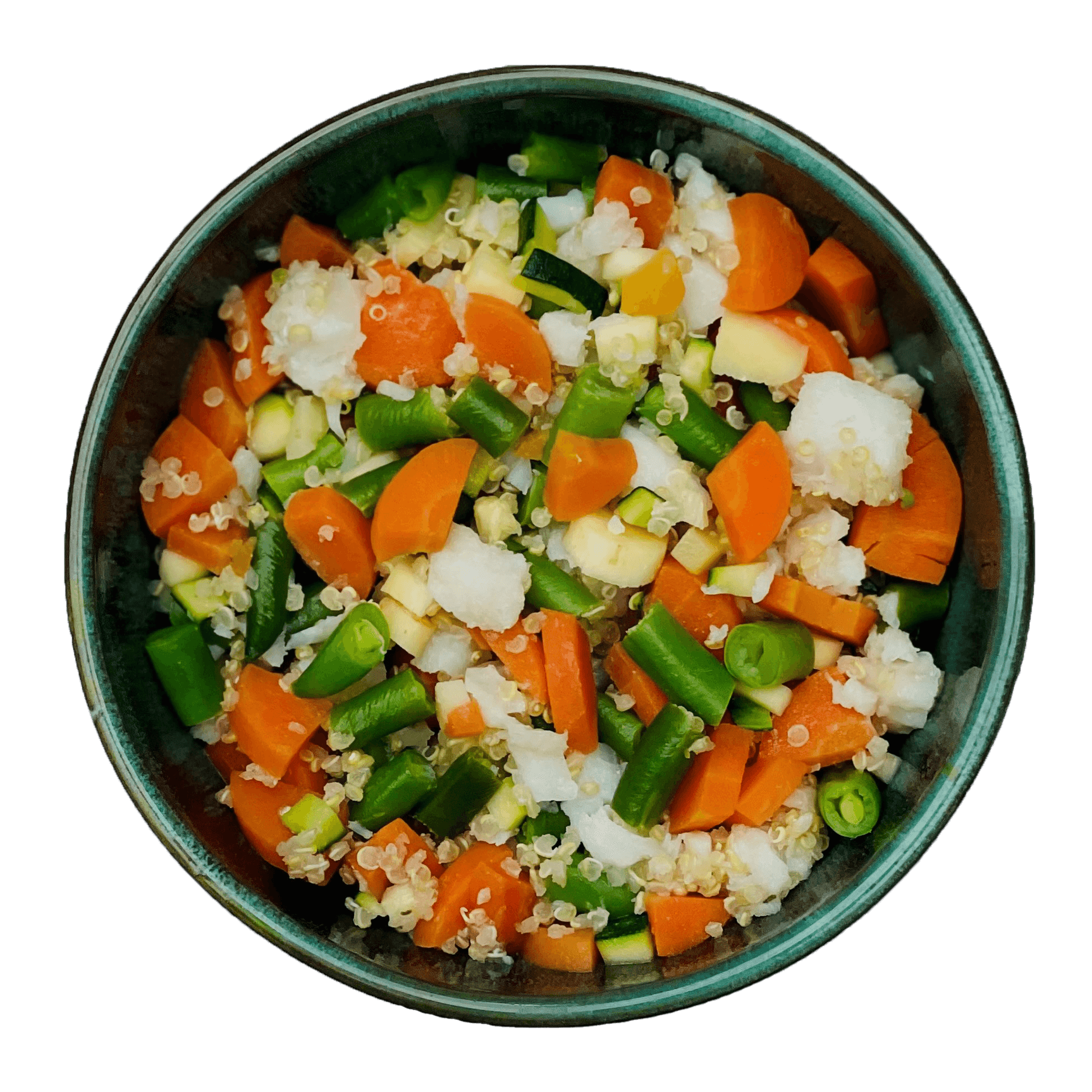 Ingrediënten: Pollak, pagasius, wortel, sperzieboon, quinoa, pastinaak, courgette, olijfolie, zalmolie