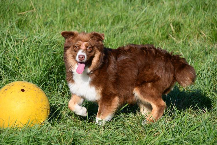 Ruby is een prachtige red tri Australian Shepherd teef met een warme, chocoladebruine vacht die een vleugje gouden glans heeft. Haar kleur lijkt bijna te stralen in het zonlicht en benadrukt haar zachte, liefdevolle persoonlijkheid. Met haar lieve blik en bijzondere tint trekt Ruby meteen de aandacht.