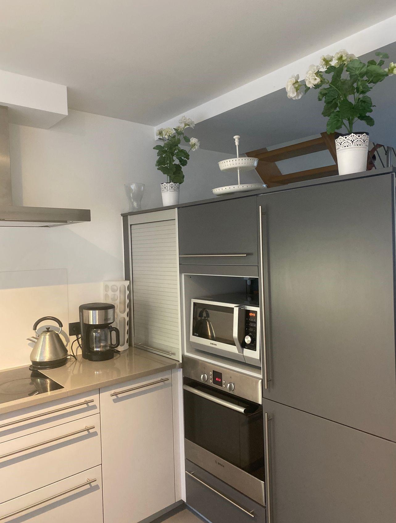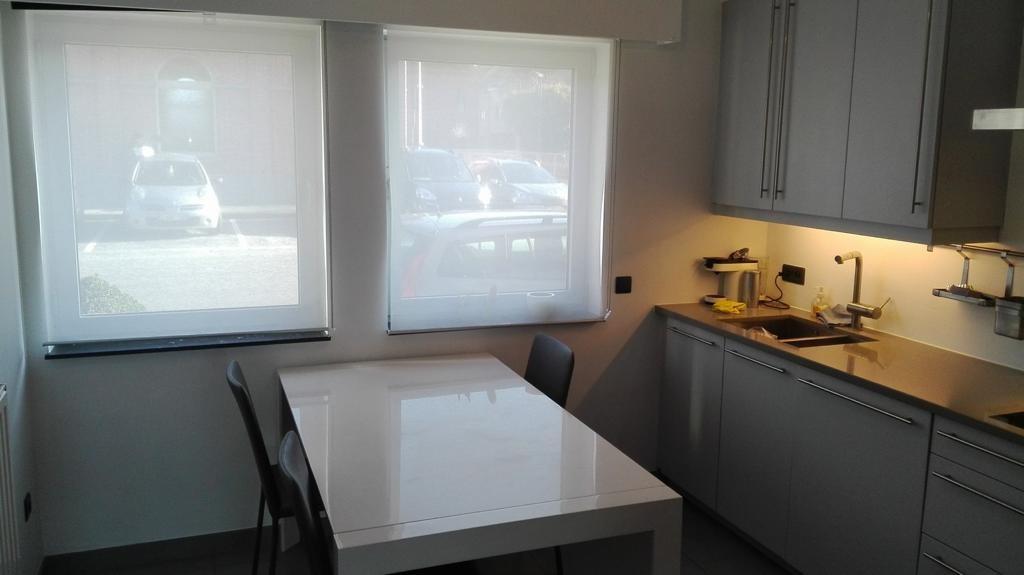 Gelijkvloers: inkomhal, living met trap naar boven en schuifdeur naar terras en tuintje, sas, volledig ingerichte keuken, sas, toilet en berging