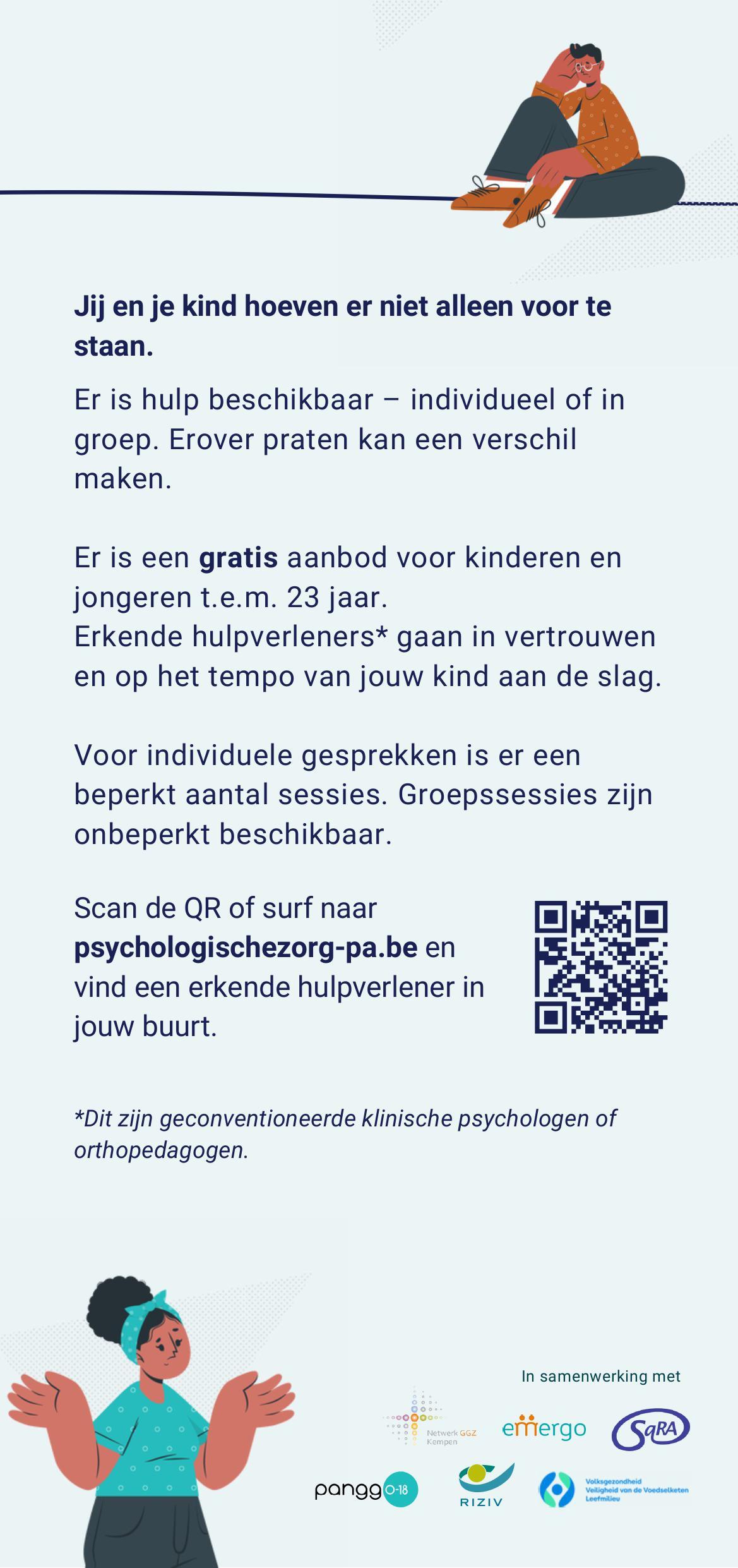 Meer info en een overzicht van erkende hulpverleners in jouw buurt vind je op psychologischezorg-pa.be.
