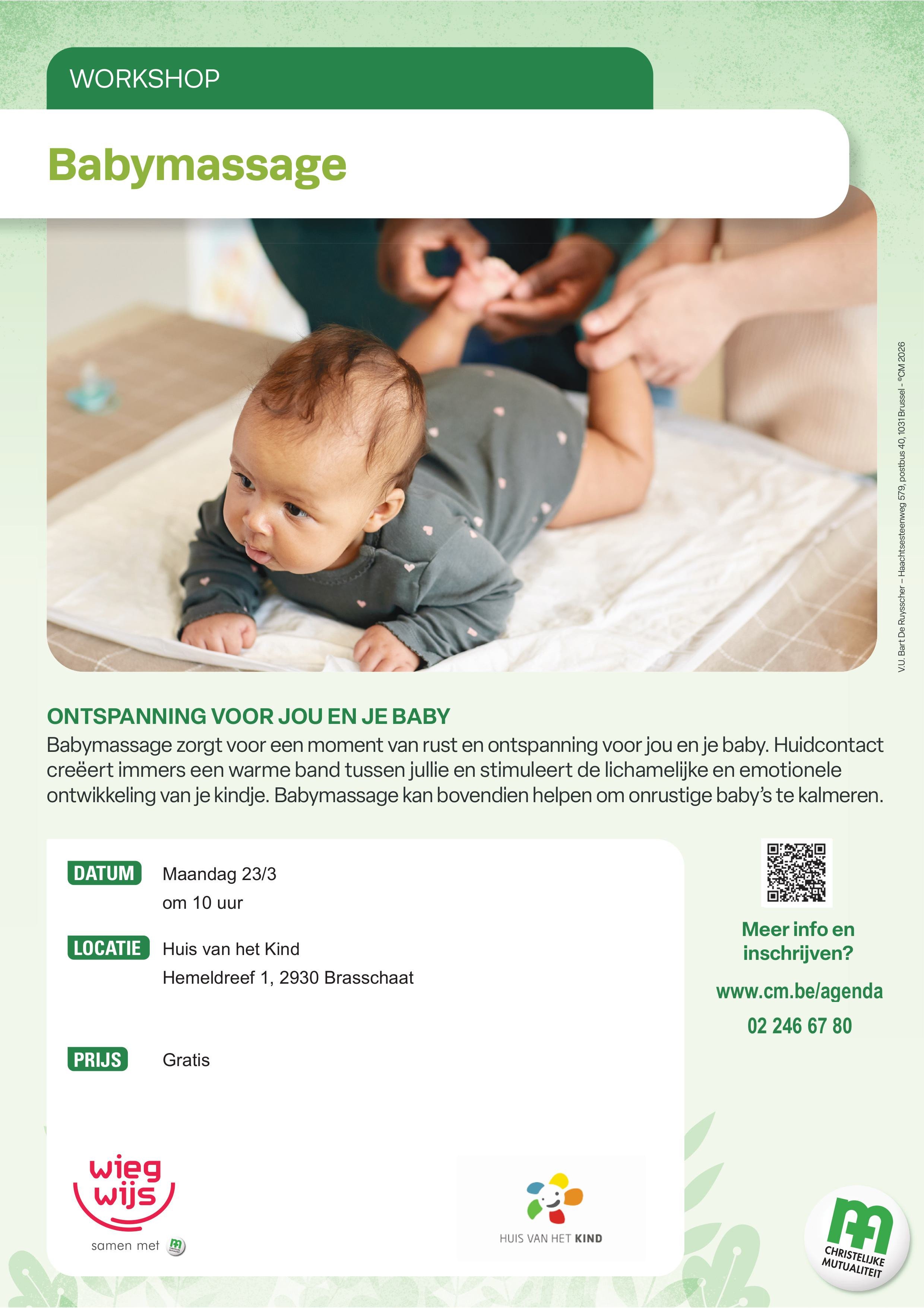 In deze workshop babymassage leer je onder begeleiding van een deskundige je baby op een speelse en creatieve manier masseren. De aangeleerde technieken kan je nadien thuis toepassen waar en wanneer het jou past.