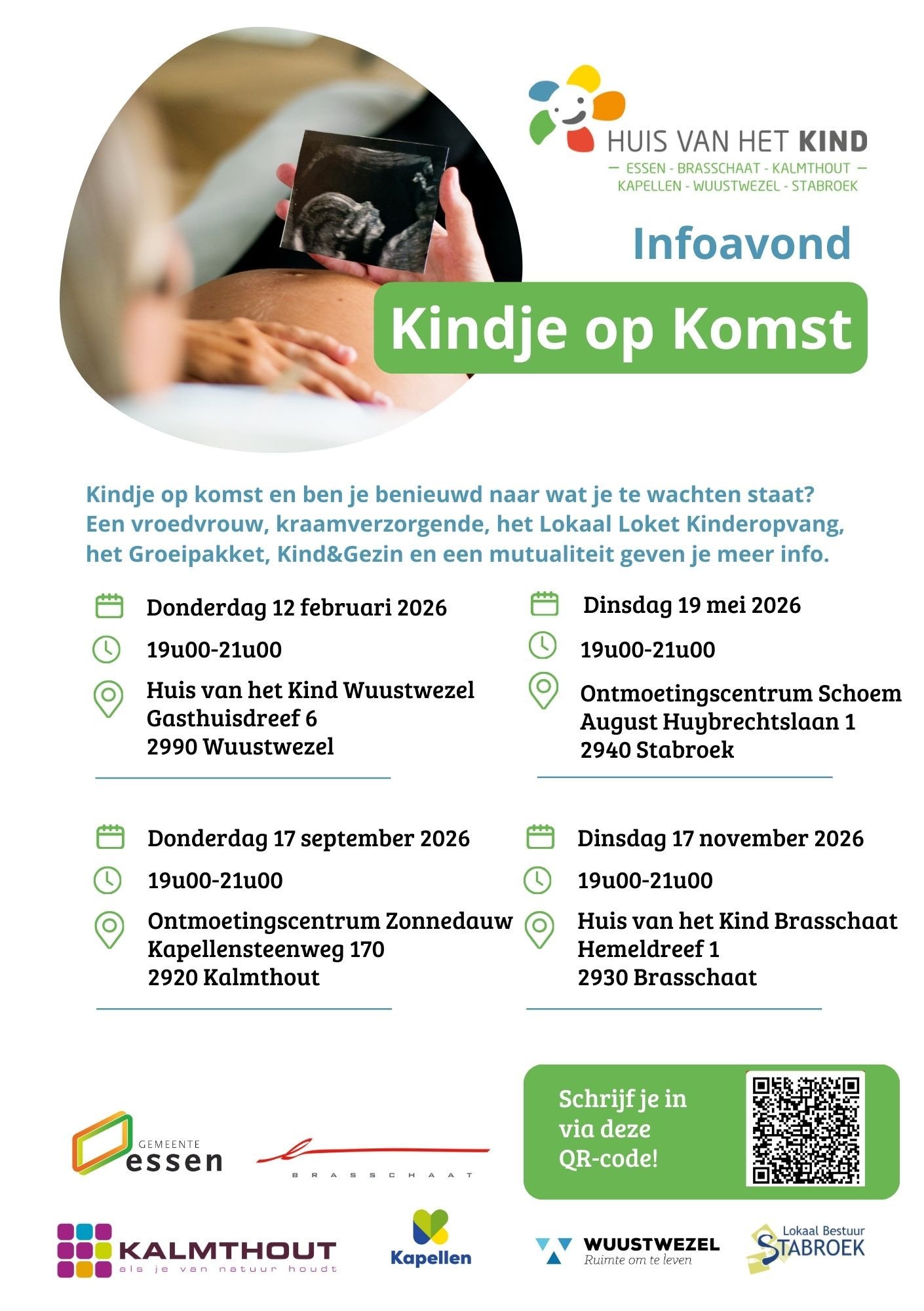 Tijdens de infoavond "Kindje op Komst" krijg je een antwoord op al je vragen, twijfels en bezorgdheden. Verschillende organisaties (vroedvrouw, kraamzorg, Groeipakket, Kind&Gezin en mutualiteit) zijn aanwezig om je meer informatie te geven over alle fasen van de zwangerschap tot de geboorte.