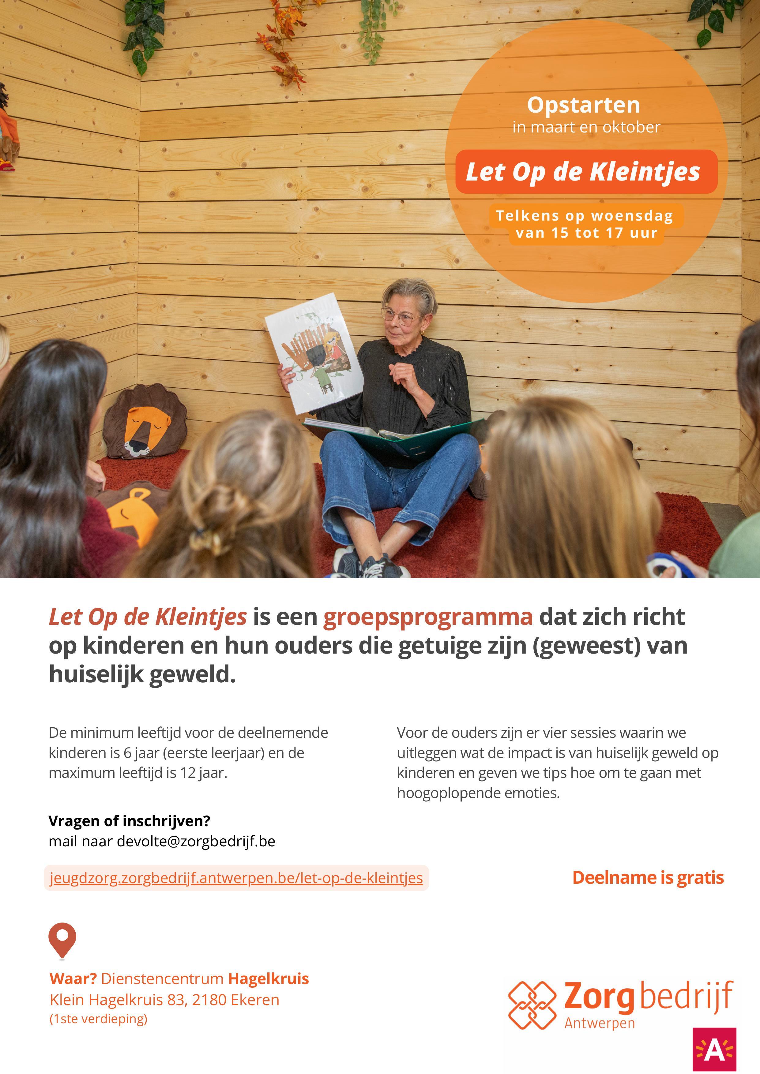 Let Op de Kleintjes is een groepsprogramma dat zich richt op kinderen en hun ouders die getuige zijn (geweest) van huiselijk geweld.
