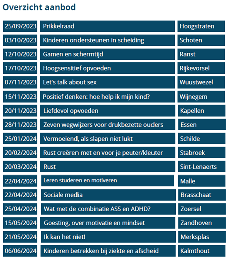 Naast dit individueel aanbod, organiseeert de Opvoedingswinkel ook lezingen, vormingen en oudergroepen. In dit boekje vind je het aanbod voor het schooljaar 2023-2024.