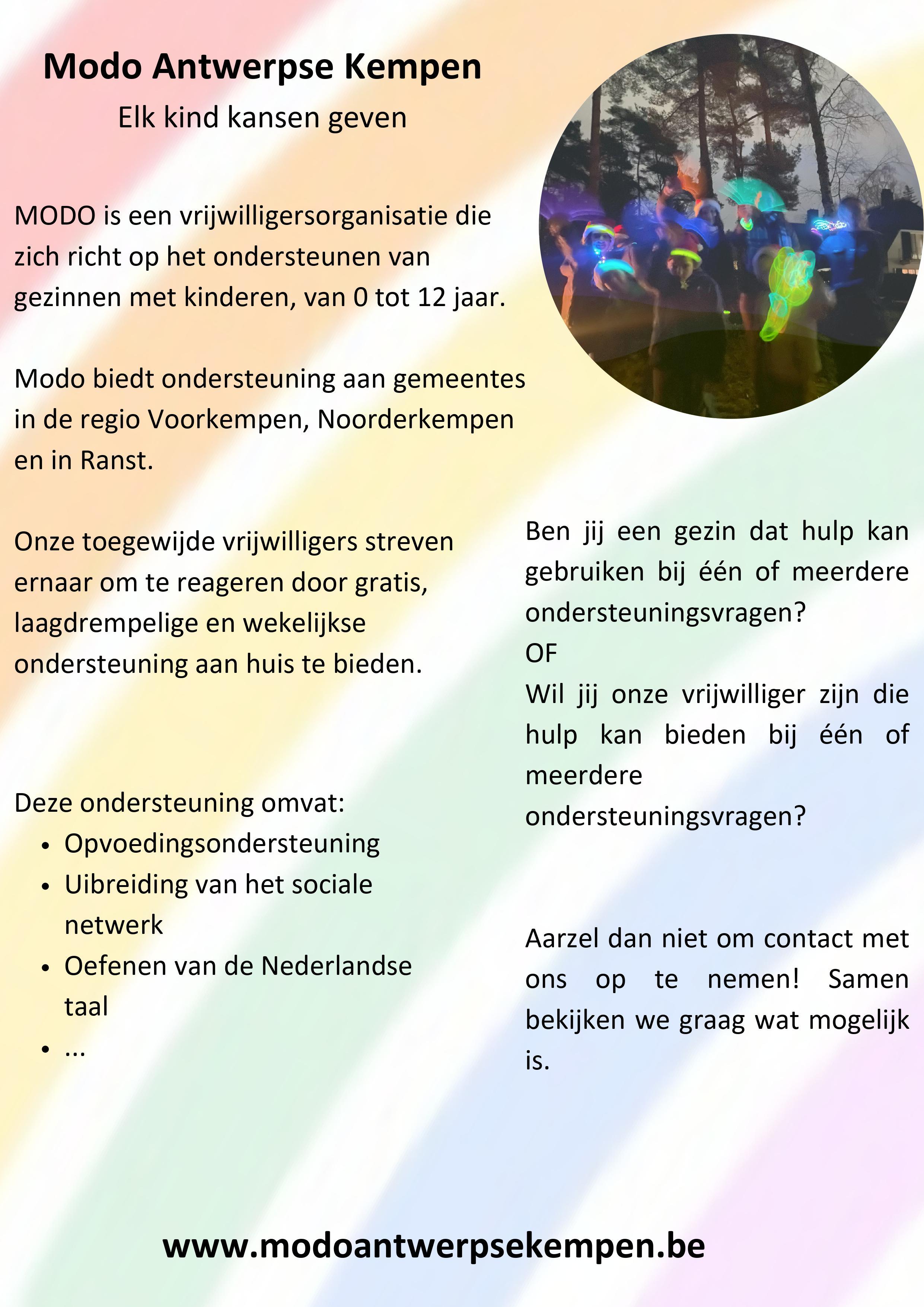 MODO richt op het ondersteunen van gezinnen met kinderen, van 0 tot 12 jaar en dit binnen de gemeentes in de regio Voorkempen, Noorderkempen en in Ranst. Toegewijde vrijwilligers streven ernaar om te reageren door gratis, laagdrempelige en wekelijkse ondersteuning aan huis te bieden. Deze ondersteuning omvat: Opvoedingsondersteuning, uibreiding van het sociale netwerk, oefenen van de Nederlandse taal, ...