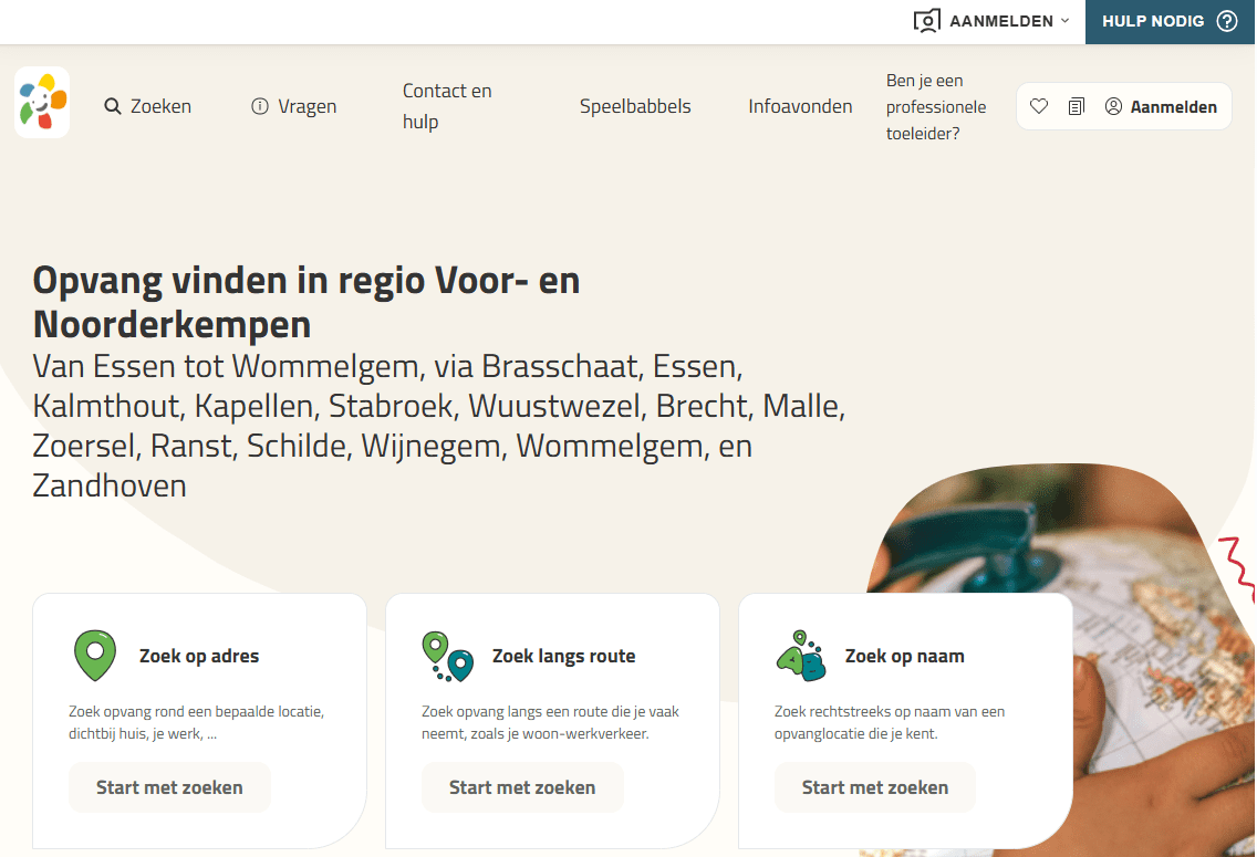 Ouders die een opvangplaats voor hun kind zoeken in regio Voor- of Noorderkempen kunnen vanaf nu terecht op de website www.kinderopvangvoorennoorderkempen.be. Van Essen tot Wommelgem, via Brasschaat, Essen, Kalmthout, Kapellen, Stabroek, Wuustwezel, Brecht, Malle, Zoersel, Ranst, Schilde, Wijnegem, Wommelgem, en Zandhoven.
