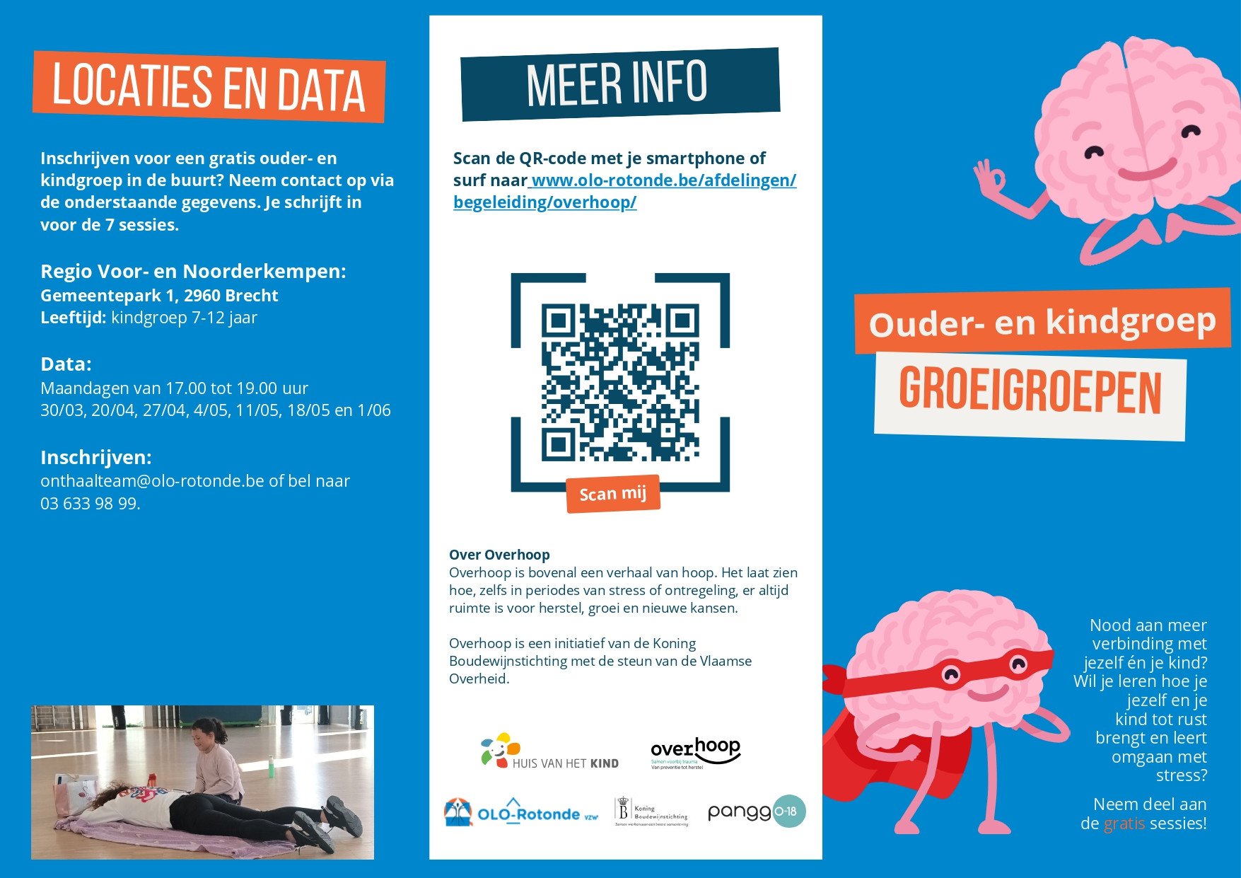 OverHoop organiseert laagdrempelige, gratis groepssessies voor ouders en kinderen. Tijdens de sessies helpen we met stressregulatie, leren voelen wat er in jouw lichaam gebeurt, spanning en stress leren herkennen en hoe deze te communiceren.